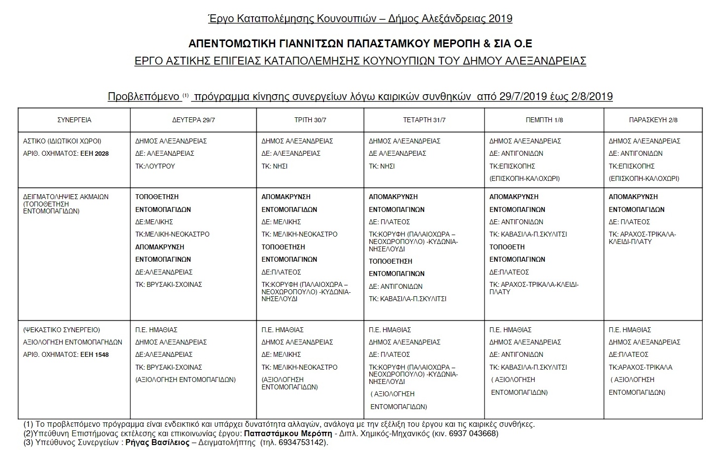 - Εφαρμογές επίγειων υπολειμματικών ψεκασμών ακμαιοκτονίας (LV) σε επιλεγμένες θέσεις ανάπαυσης ή δραστηριότητας των κουνουπιών στο αστικό και περιαστικό σύστημα του Δήμου Αλεξάνδρειας, όπως αποδεικνύεται βάσει των ευρημάτων των παγίδων σύλληψης ακμαίων κουνουπιών.