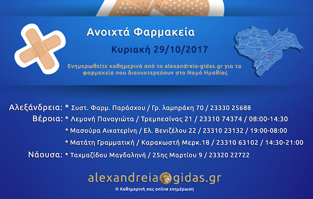ΤΟΠΙΚΑ 29 Οκτωβρίου, 2017 posted by admin Share Ανοιχτά φαρμακεία Ημαθίας Κυριακή 29 Οκτωβρίου Αλεξάνδρεια: Αφήστε μια απάντηση Ακύρωση απάντησηςΗ ηλ. διεύθυνση σας δεν δημοσιεύεται. Τα υποχρεωτικά πεδία σημειώνονται με *Σχόλιο * Όνομα Email Ιστότοπος Αποθήκευσε το όνομά μου, email, και τον ιστότοπο μου σε αυτόν τον πλοηγό για την επόμενη φορά που θα σχολιάσω.