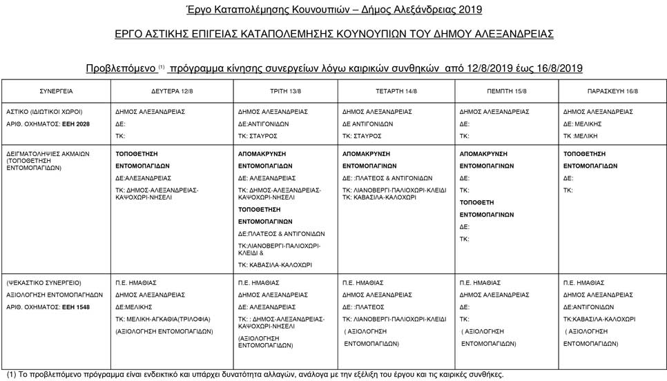 Ο δήμος Αλεξάνδρειας ανακοινώνει το πρόγραμμα Αστικής Επίγειας Καταπολέμησης Κουνουπιών για την εβδομάδα από Δευτέρα 12, έως και Παρασκευή 16 Αυγούστου 2019.