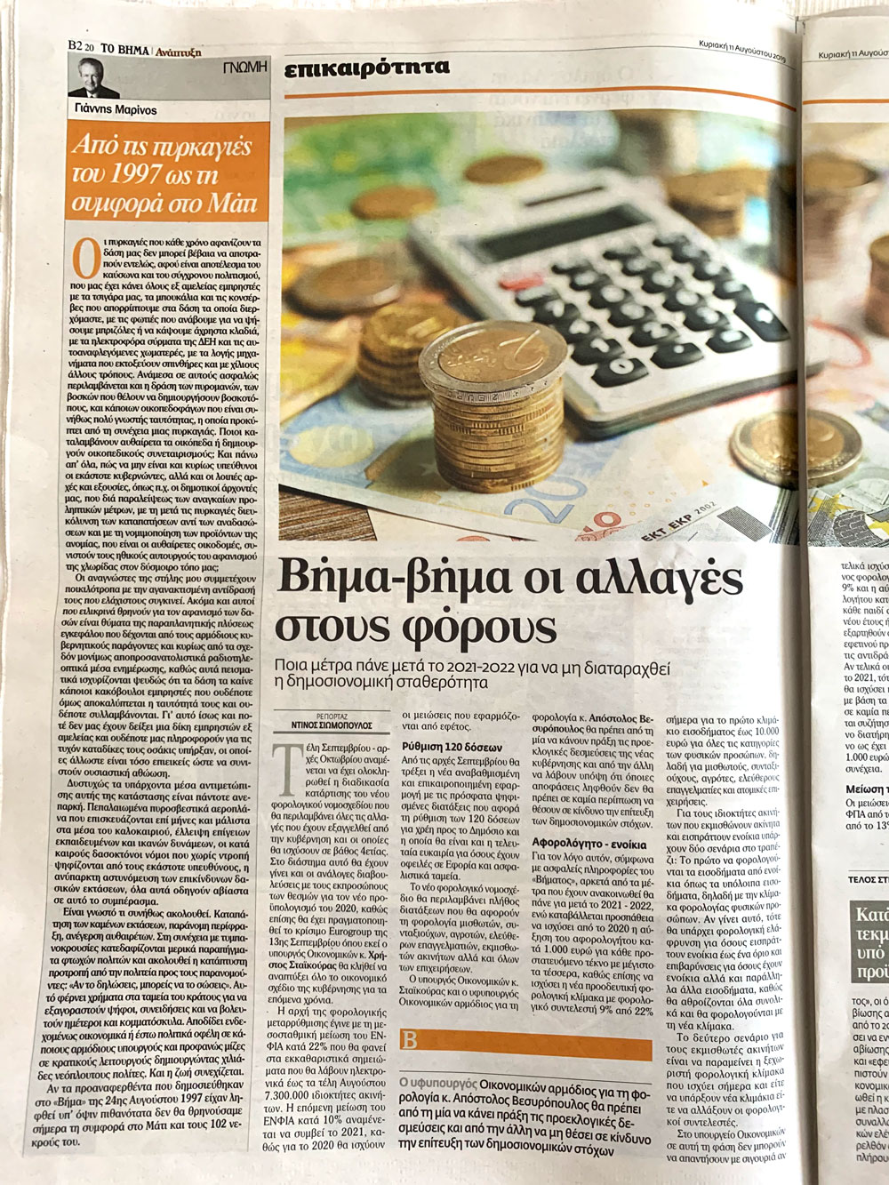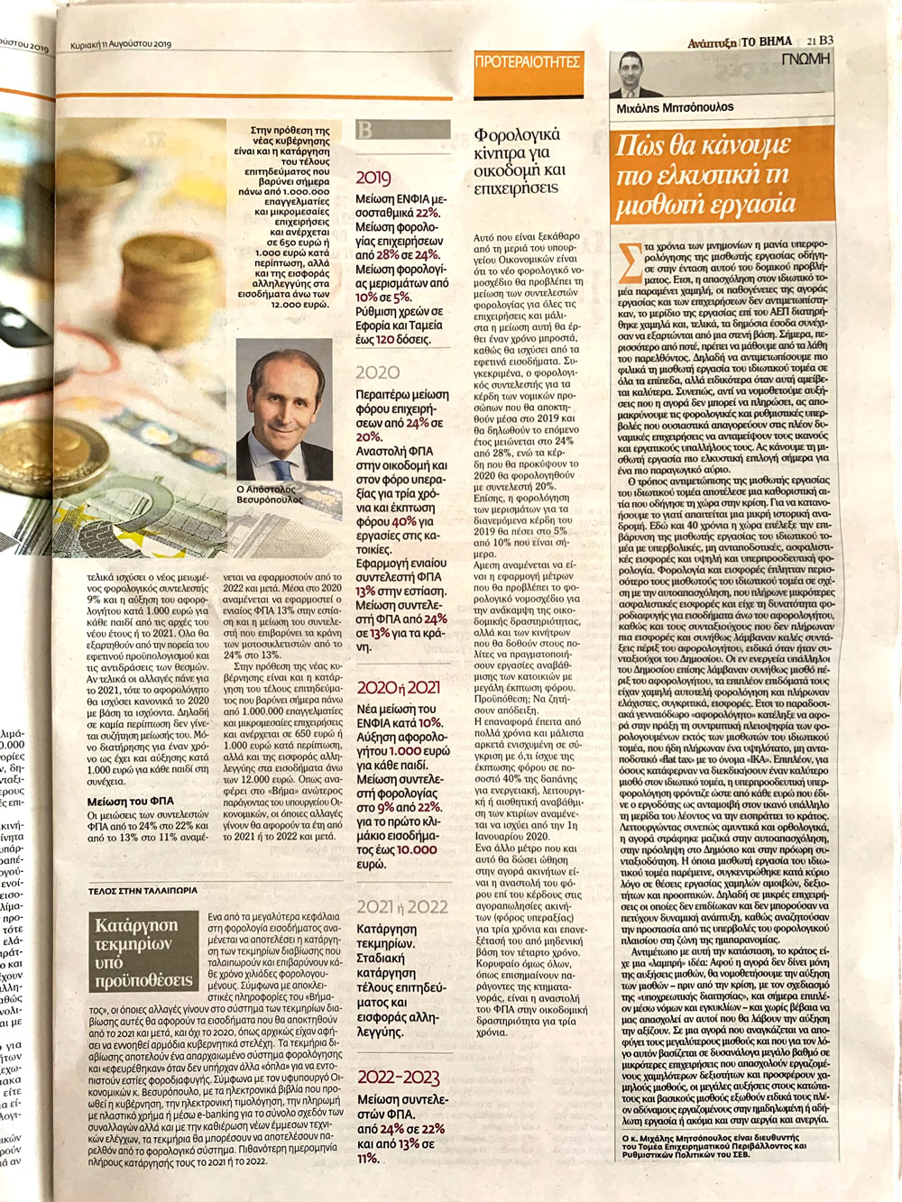 Το ΒΗΜΑ της Κυριακής 11 Αυγούστου 2019 έκανε δισέλιδο αφιέρωμα στις αλλαγές στους φόρους.