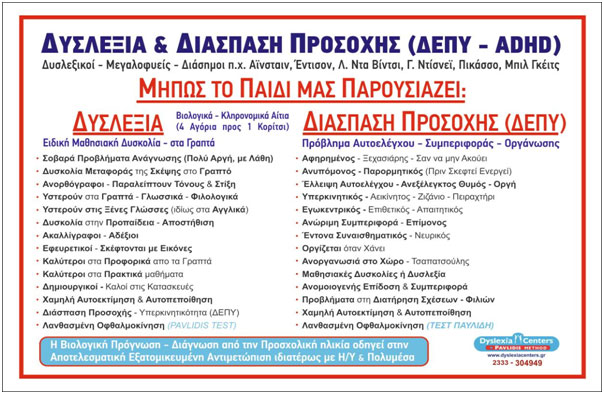 Τα Dyslexia Centers – Pavlidis Method Αλεξάνδρειας, κατόπιν μεγάλης ζήτησης συνεχίζουν να προσφέρουν, μέχρι τέλη Νοεμβρίου, το διαγνωστικό τεστ Διάσπασης Προσοχής (ΔΕΠΥ) και Δυσλεξίας με έκπτωση 50%.