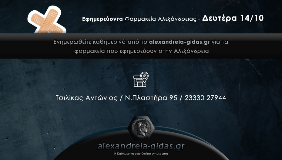 ΤΟΠΙΚΑ 14 Οκτωβρίου, 2019 posted by admin Share Ποιο φαρμακείο εφημερεύει σήμερα Δευτέρα στην Αλεξάνδρεια Αλεξάνδρεια: Αφήστε μια απάντηση Ακύρωση απάντησηςΗ ηλ. διεύθυνση σας δεν δημοσιεύεται. Τα υποχρεωτικά πεδία σημειώνονται με *Σχόλιο * Όνομα Email Ιστότοπος Αποθήκευσε το όνομά μου, email, και τον ιστότοπο μου σε αυτόν τον πλοηγό για την επόμενη φορά που θα σχολιάσω.