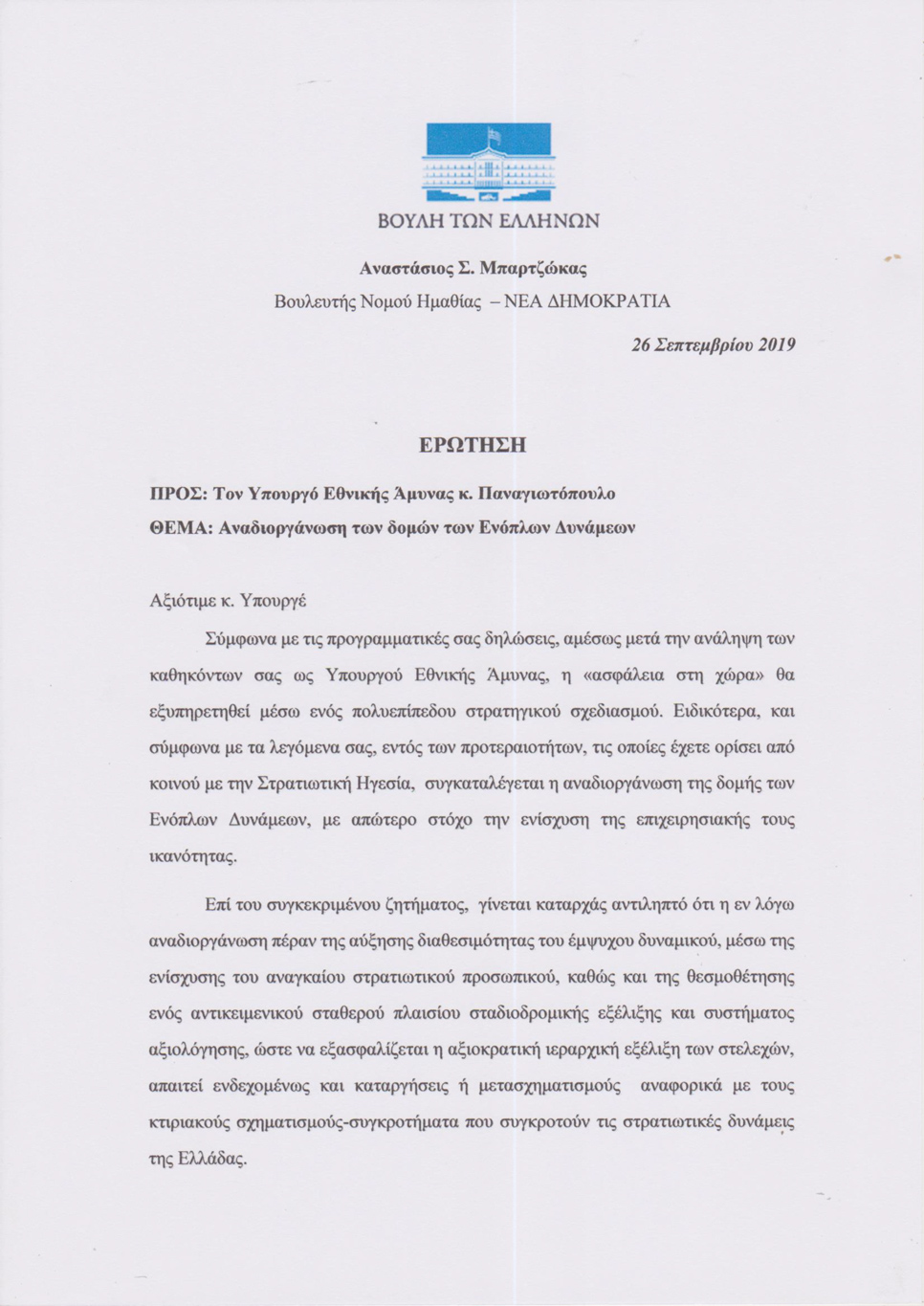 – Απάντηση του Υπουργού σε πρόσφατη Ερώτηση του βουλευτή στη Βουλή για την διατήρηση της 1ης Μεραρχίας Πεζικού στη Βέροια
