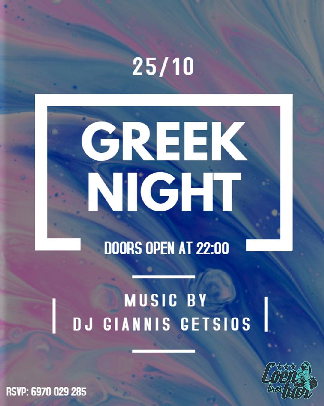 Σήμερα Παρασκευή 25 Οκτωβρίου 2019 το COEN Bar μας περιμένει με GREEK NIGHT. Στα decks θα βρίσκεται ο dj Giannis Getsos.