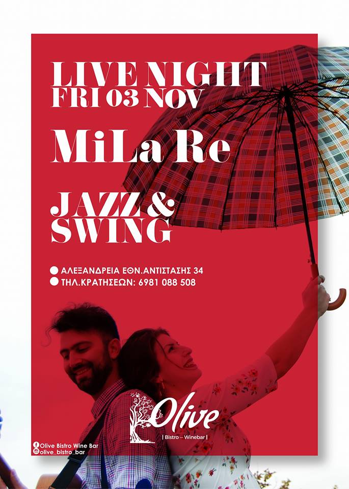 Οι MiLa Re με jazz και swing ακούσματα επιστρέφουν και συντροφιά με καλή διάθεση αλλά και τις υπέροχες γεύσεις του OLIVE μας υπόσχονται ένα υπέροχο βράδυ!
