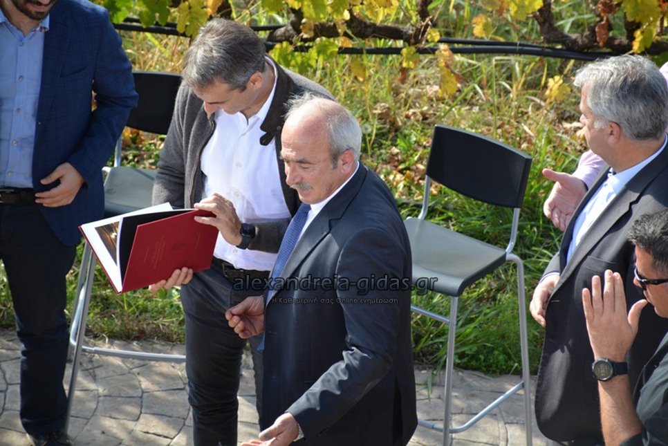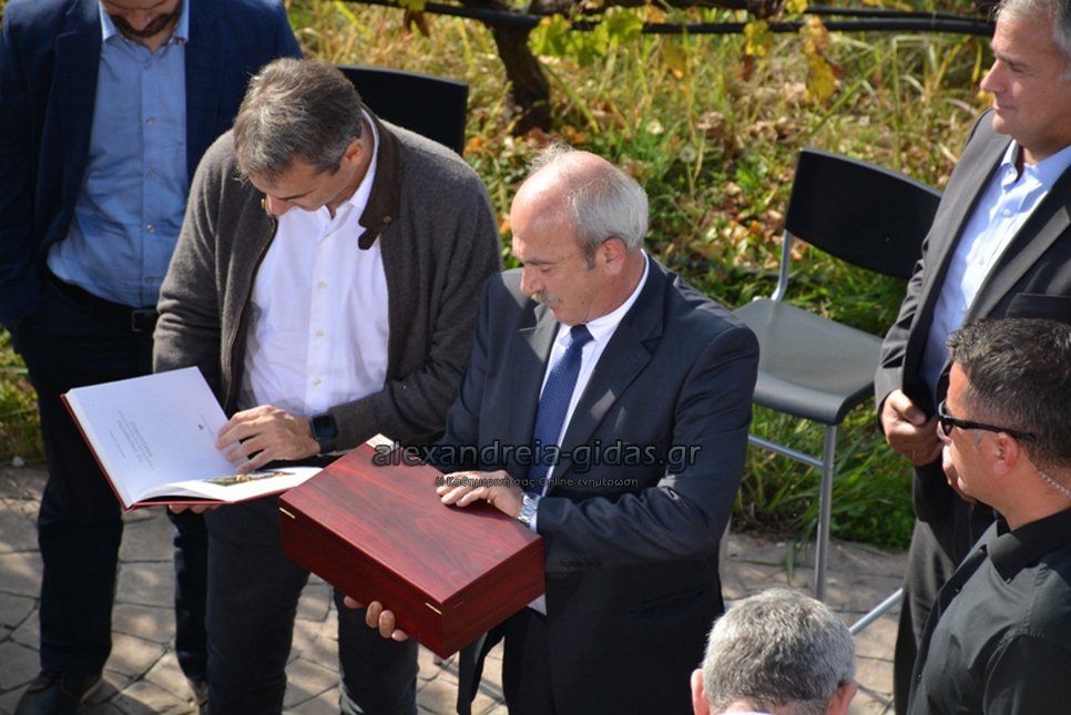 Φεύγοντας ο Πρωθυπουργός δέχθηκε δώρα από τους οινοπαραγωγούς, τι άλλο από ξεχωριστά και σπάνια κρασιά, καθώς και ενός βιβλίου για το ξινόμαυρο.