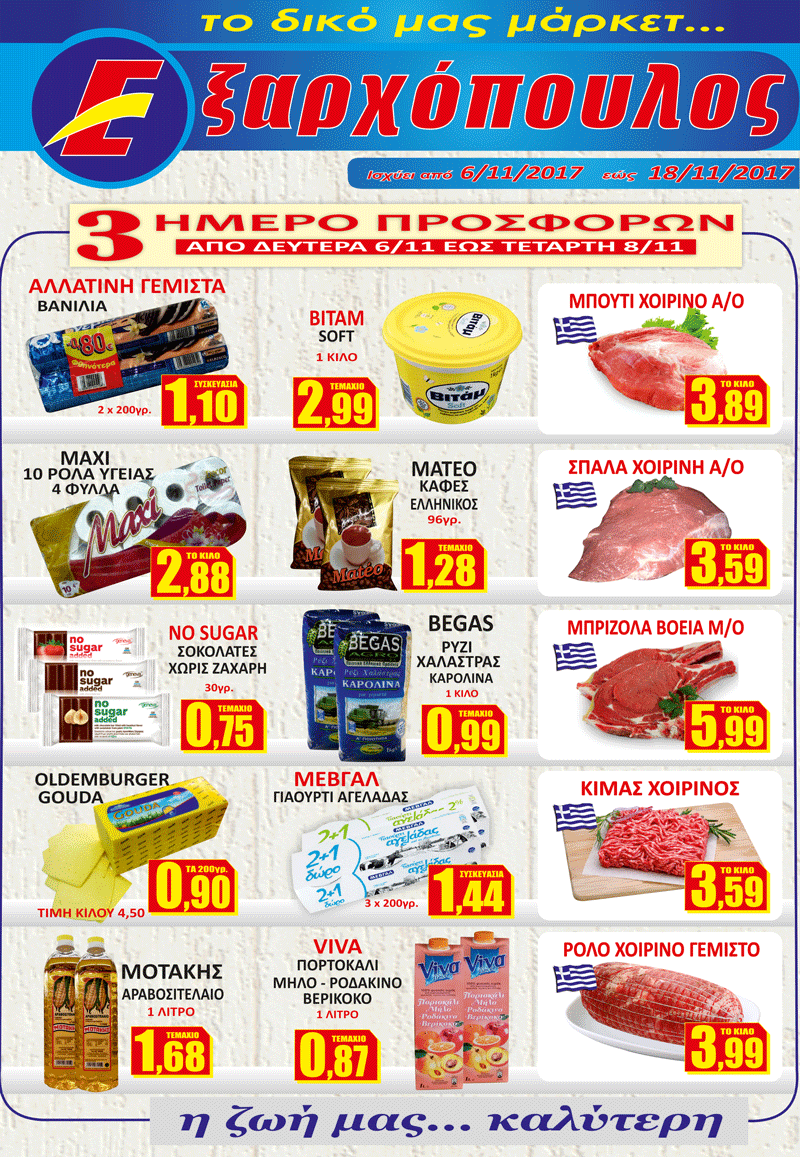 Το τοπικό σούπερ μάρκετ ΕΞΑΡΧΟΠΟΥΛΟΣ από την Δευτέρα 6 Νοεμβρίου μέχρι και την Τετάρτη 8 Νοεμβρίου προσθέτει 15 νέα έκτακτα προϊόντα στις προσφορές του καταστήματος!