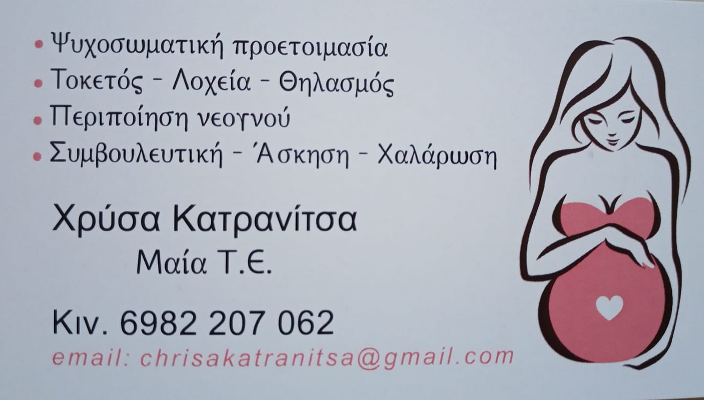 Η Χρύσα Κατρανίτσα είναι Μαία Τ.Ε. από τον δήμο Αλεξάνδρειας. και προσκαλεί τις μέλλουσες μητέρες να γνωριστούν με:
