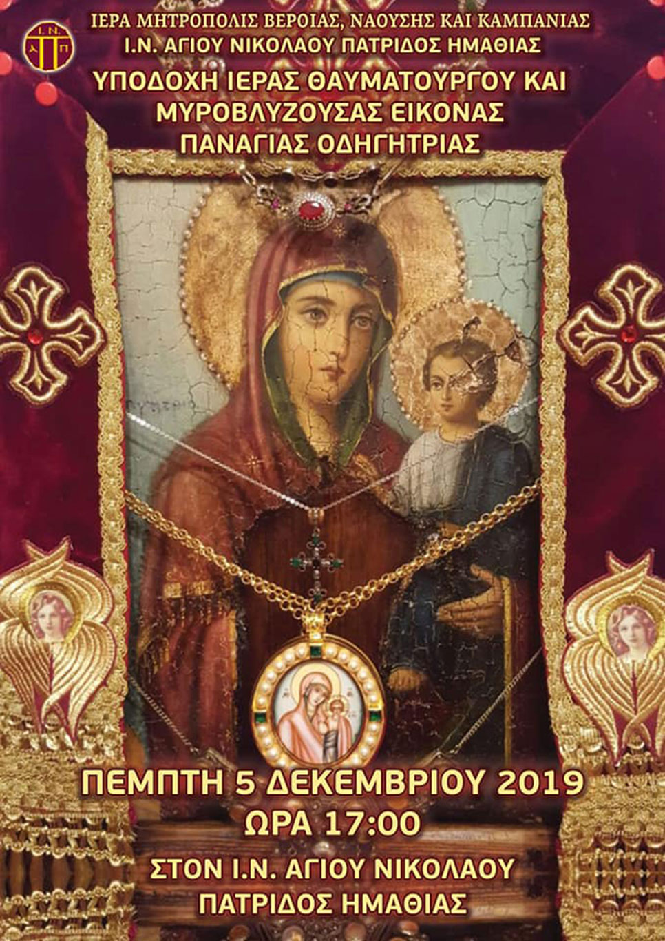 Την Σεβάσμια και Εφέστια Εικόνα της Παναγίας Οδηγήτριας της Μυροβλύζουσας θα υποδεχθεί ο Ιερός Ναός Αγίου Νικολάου Πατρίδας Ημαθίας, επ’ ευκαιρία της Πανηγύρεώς του, την Πέμπτη 5 Δεκεμβρίου 2019.
