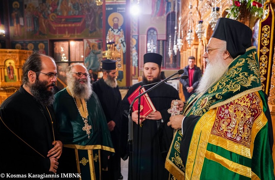 Στο τέλος του Εσπερινού ο Σεβασμιώτατος χειροθέτησε Πρωτοπρεσβύτερο τον π. Βασίλειο Παπαχρήστο και του ευχήθηκε με την ευκαιρία της νέας του διακονίας ως Προϊστάμενος του Ιερού Ναού του Αγίου Αλεξάνδρου Αλεξάνδρειας.