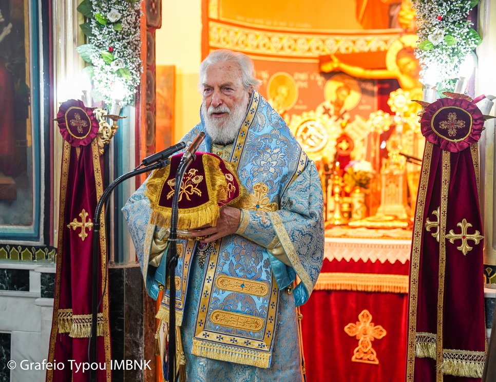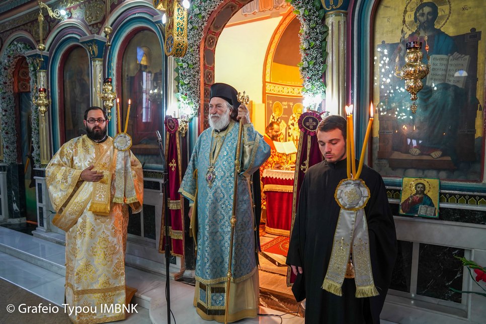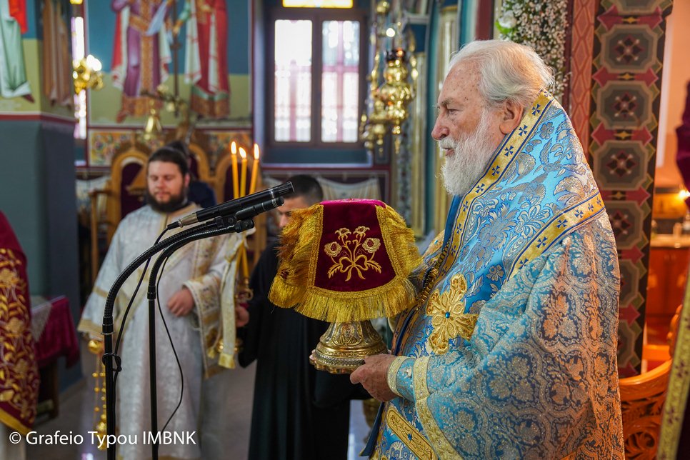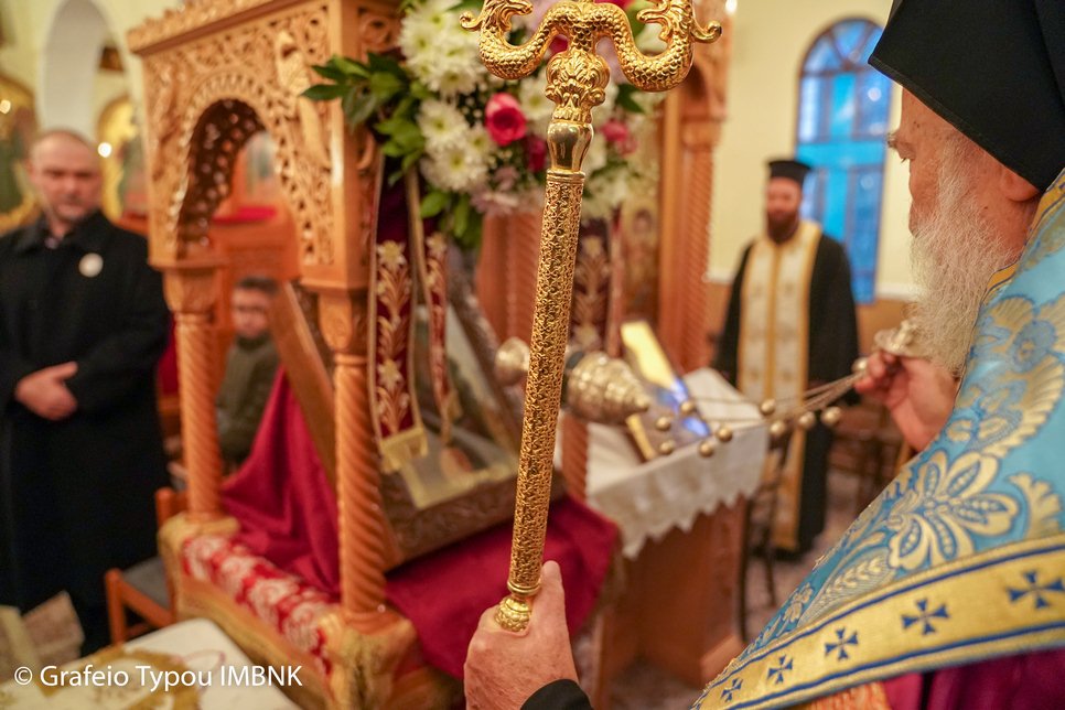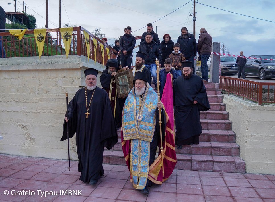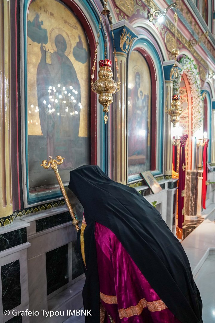 Την παραμονή της εορτής το εσπέρας στον πανηγυρίζοντα Ιερό Ναό του Αγίου Νικολάου Πατρίδας, ο Θεοφιλέστατος υποδέχθηκε την Ιερά Εικόνα της Παναγίας της Οδηγήτριας, η οποία μυροβλίζει συνεχώς, και στη συνέχεια χοροστάτησε στον Πανηγυρικό Εσπερινό και κήρυξε το θείο λόγο.