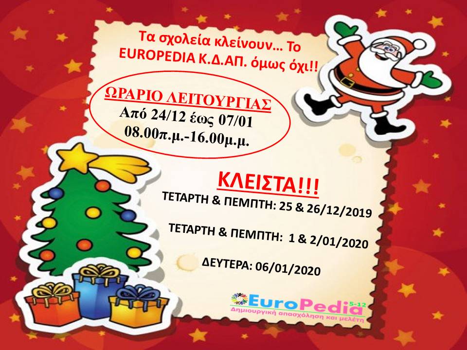 Στη διάρκεια των εορτών το Κέντρο Δημιουργικής Απασχόλησης EUROPEDIA θα λειτουργήσει:
