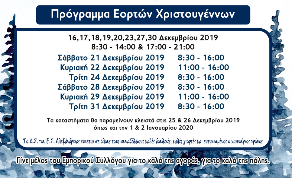 Αύριο Σάββατο 21 και την Κυριακή 22 Δεκεμβρίου 2019 τα μαγαζιά της Αλεξάνδρειας θα λειτουργήσουν με συνεχόμενο ωράριο.