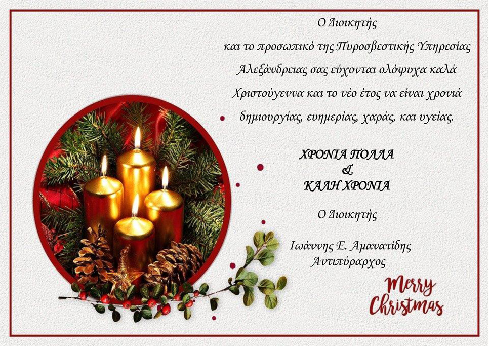 ΤΟΠΙΚΑ 24 Δεκεμβρίου, 2019 posted by admin Share Οι ευχές των εορτών από τους πυροσβέστες της Αλεξάνδρειας Τις ευχές της Πυροσβεστικής Υπηρεσίας Αλεξάνδρειας απέστειλε ο Διοικητής Γιάννης Αμανατίδης: Αφήστε μια απάντηση Ακύρωση απάντησηςΗ ηλ. διεύθυνση σας δεν δημοσιεύεται. Τα υποχρεωτικά πεδία σημειώνονται με *Σχόλιο * Όνομα Email Ιστότοπος Αποθήκευσε το όνομά μου, email, και τον ιστότοπο μου σε αυτόν τον πλοηγό για την επόμενη φορά που θα σχολιάσω.