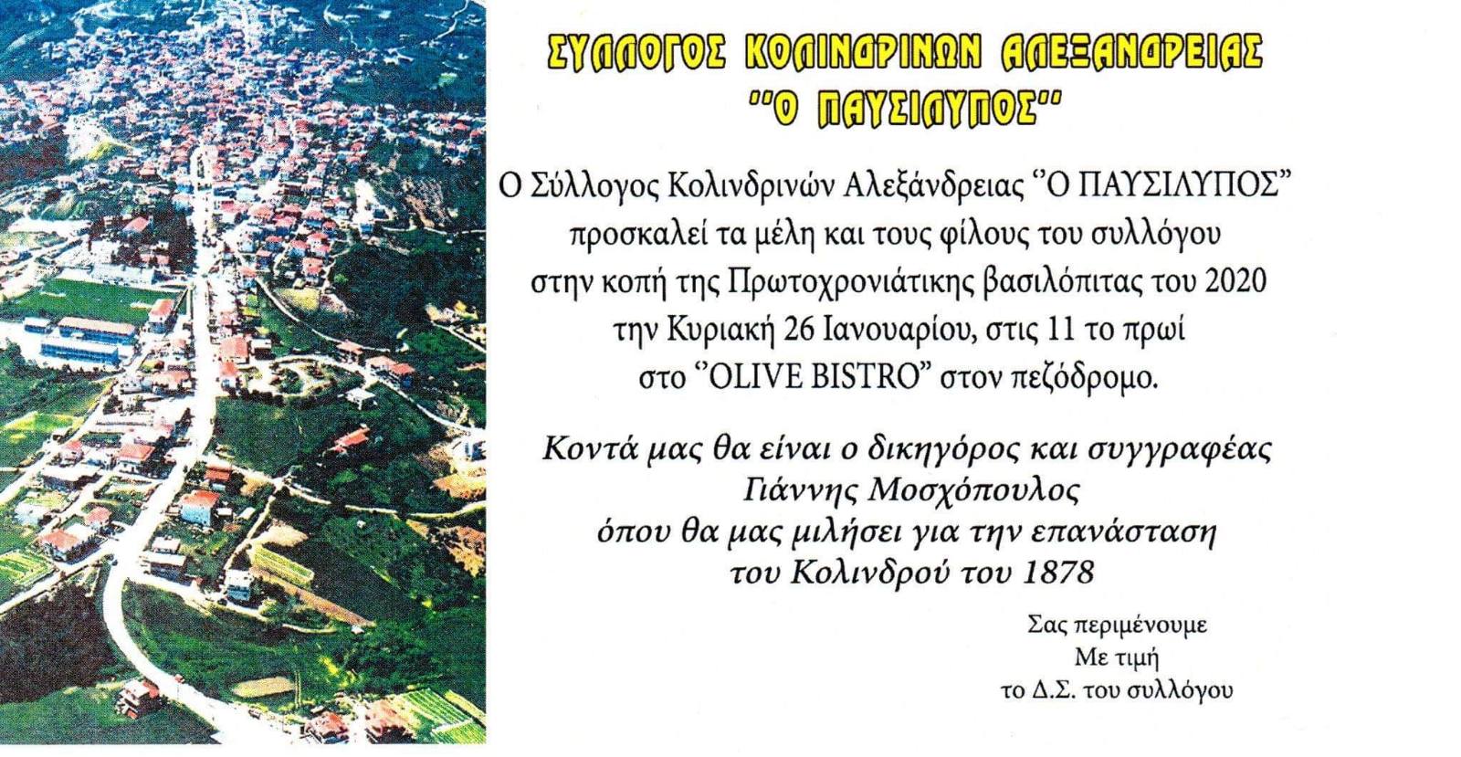 Ο σύλλογος Κολινδρινών Αλεξάνδρειας “Ο Παυσίλυπος” προσκαλεί τα μέλη και τους φίλους του συλλόγου, στην κοπή της πρωτοχρονιάτικης βασιλόπιτας του 2020, την Κυριακή στις 26 Ιανουαρίου 2020 στις 11 το πρωί στο “OLIVE BISTRO” στον πεζόδρομο.