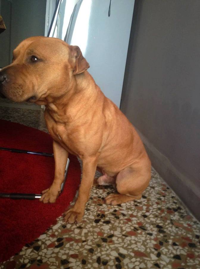 Είναι πίτμπουλ, πολύ φιλικός και ακούει στο όνομα Κούμπα.