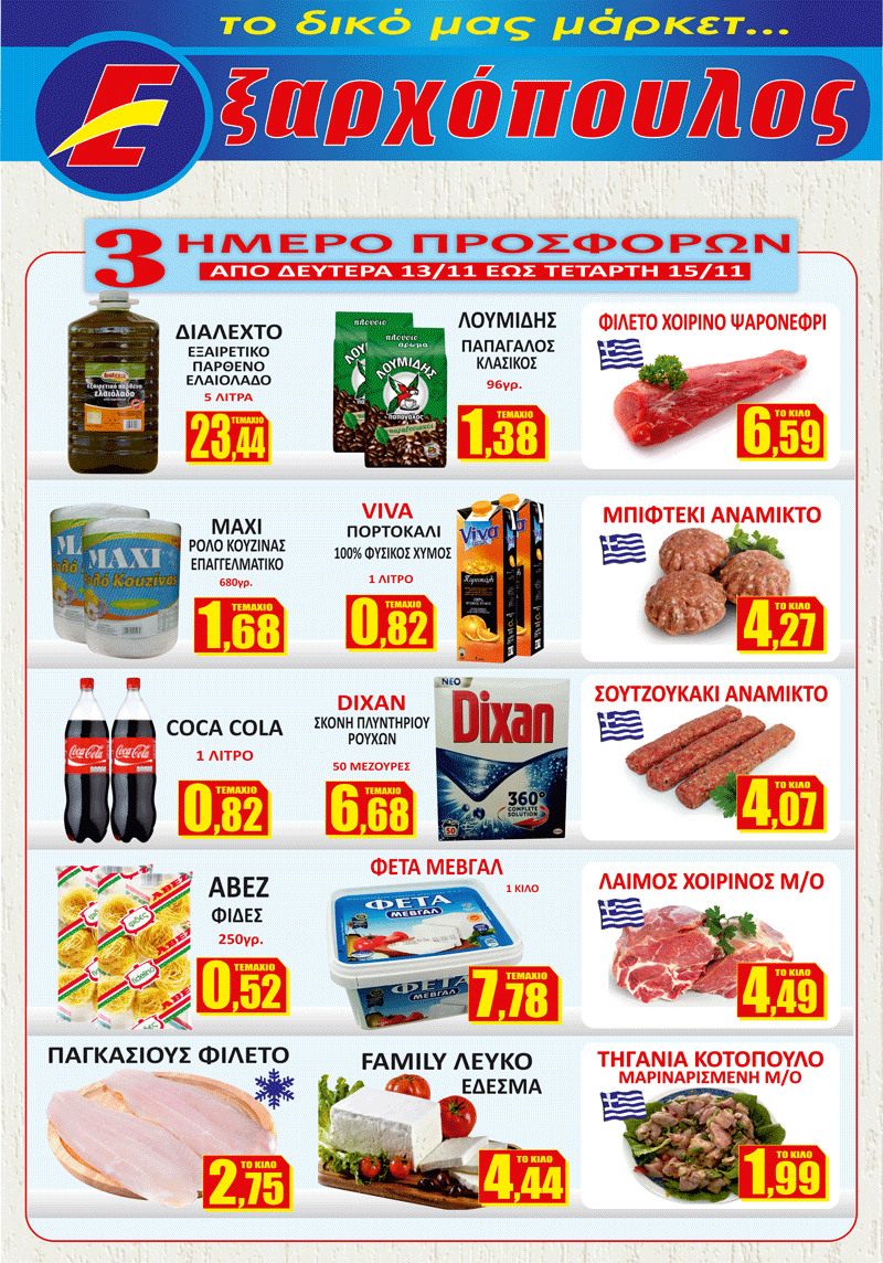 Το τοπικό σούπερ μάρκετ ΕΞΑΡΧΟΠΟΥΛΟΣ από την Δευτέρα 13 Νοεμβρίου μέχρι και την Τετάρτη 15 Νοεμβρίου προσθέτει 15 νέα έκτακτα προϊόντα στις προσφορές του καταστήματος!