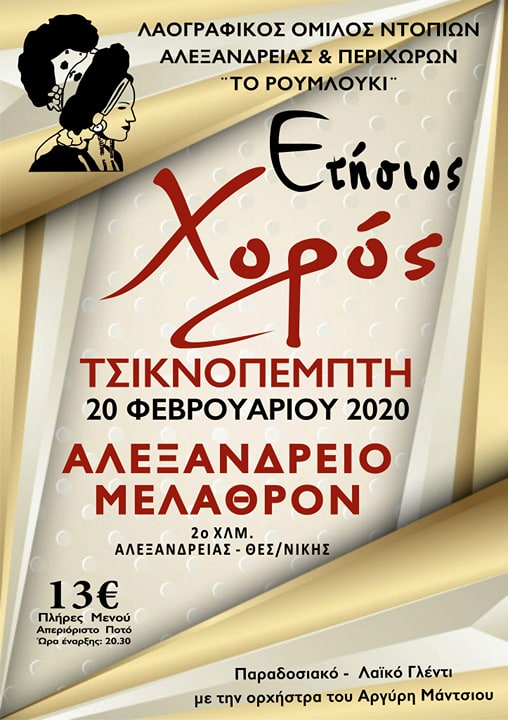Ο Λαογραφικός Όμιλος Ντόπιων Αλεξάνδρειας και περιχώρων «Το Ρουμλούκι» σας προσκαλεί στον Ετήσιο Χορό του την Τσικνοπέμπτη 20 Φεβρουαρίου 2020 στο ΑΛΕΞΑΝΔΡΕΙΟ ΜΕΛΑΘΡΟΝ.