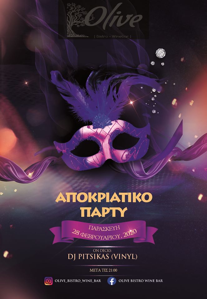 Σε Party Maske μας προσκαλεί σήμερα Παρασκευή 28 Φεβρουαρίου 2020 το OLIVE Bistro Wine Bar στον πεζόδρομο της Αλεξάνδρειας.