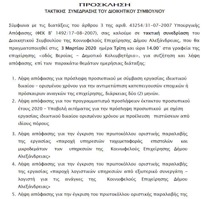 Σε προσλήψεις προσωπικού με σύμβαση εργασίας ιδιωτικού δικαίου – ορισμένου χρόνου θα προχωρήσει η Κοινωφελής Επιχείρηση του δήμου Αλεξάνδρειας.