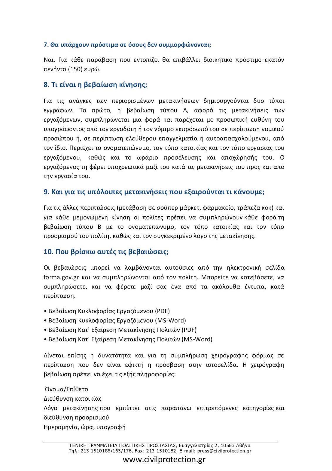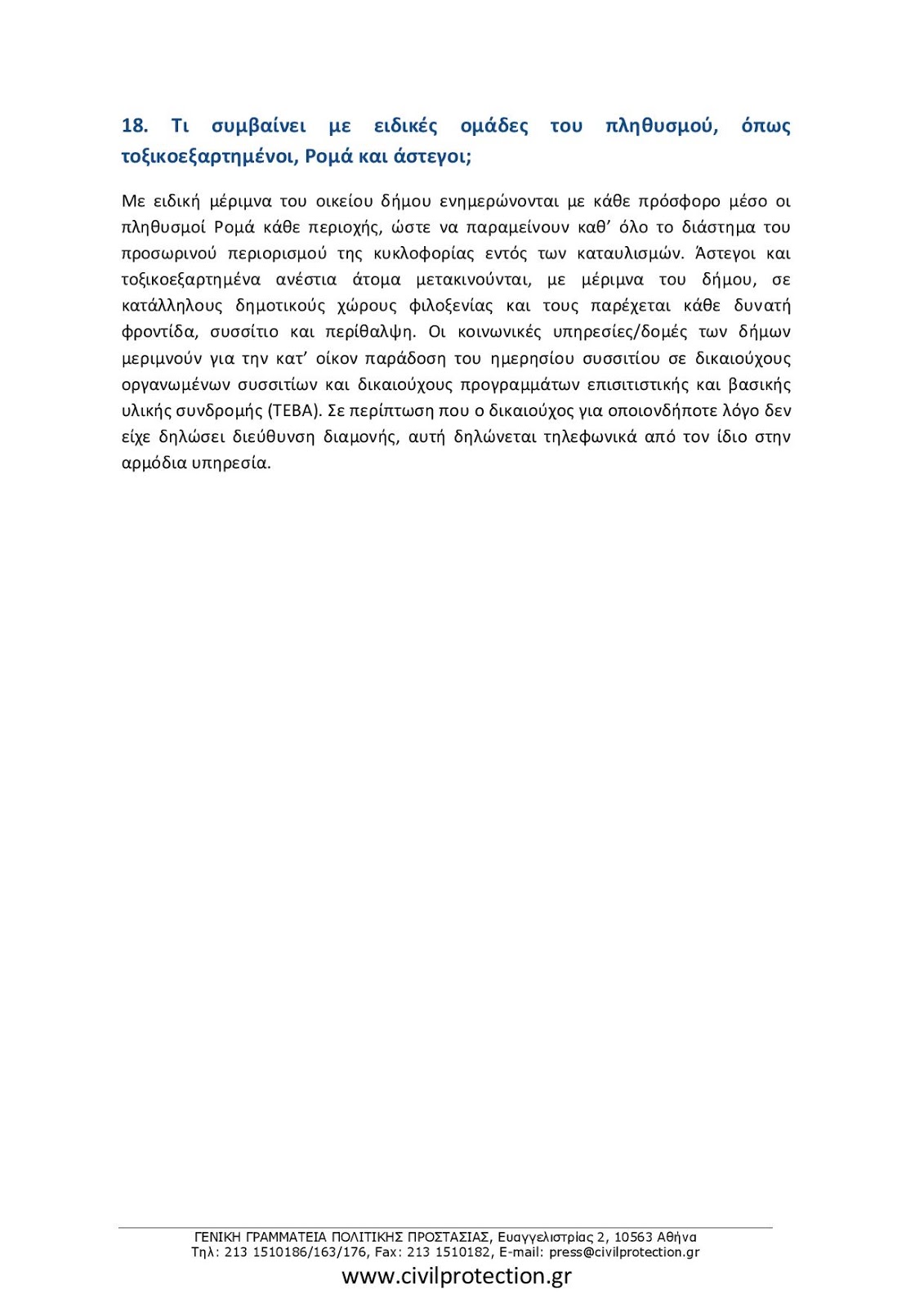 Ανακοίνωση με 18 πολύ χρήσιμες ερωτήσεις και απαντήσεις σχετικά με την απαγόρευση της κυκλοφορίας η οποία ισχύει από τις 6 το πρωί της Δευτέρας 23 Μαρτίου 2020 εξέδωσε η Γενική Γραμματεία Πολιτικής Προστασίας.