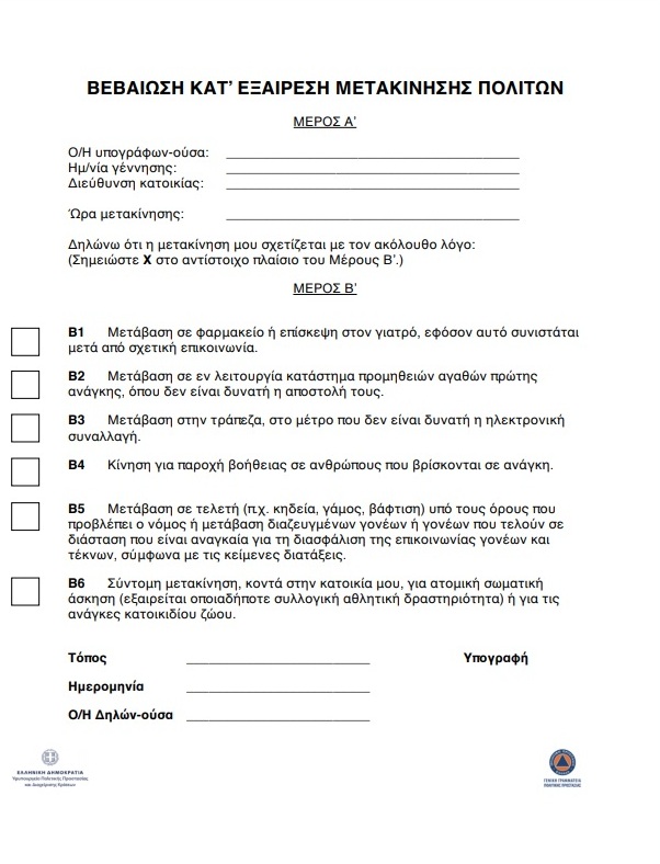Για όλες τις άλλες μετακινήσεις, η βεβαίωση κίνησης αφορά κάθε μεμονωμένη κίνηση και μόνο αυτή (τύπου Β), υπογράφεται από τον ίδιο τον ενδιαφερόμενο με προσωπική του ευθύνη και περιέχει το ονοματεπώνυμο, την ημερομηνία γέννησης, την διεύθυνση κατοικίας και την ώρα μετακίνησης του πολίτη, καθώς και τον συγκεκριμένο λόγο της μετακίνησης.