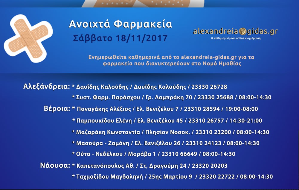 ΤΟΠΙΚΑ 18 Νοεμβρίου, 2017 posted by admin Share Ανοιχτά φαρμακεία Ημαθίας Σάββατο 18 Νοεμβρίου Αλεξάνδρεια: Αφήστε μια απάντηση Ακύρωση απάντησηςΗ ηλ. διεύθυνση σας δεν δημοσιεύεται. Τα υποχρεωτικά πεδία σημειώνονται με *Σχόλιο * Όνομα Email Ιστότοπος Αποθήκευσε το όνομά μου, email, και τον ιστότοπο μου σε αυτόν τον πλοηγό για την επόμενη φορά που θα σχολιάσω.