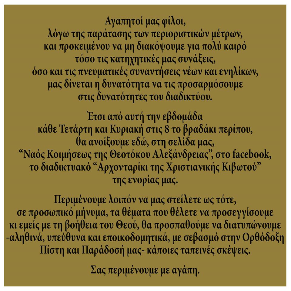 ΤΟΠΙΚΑ 31 Μαρτίου, 2020 posted by admin Share Πνευματικές συναντήσεις μέσω facebook από τον Ι.Μ.Ν. Κοιμήσεως Θεοτόκου Αλεξάνδρειας Από τον Ιερό Μητροπολιτικό Ναό Κοιμήσεως Θεοτόκου Αλεξάνδρειας εκδόθηκε η παρακάτω ανακοίνωση: 1 Comment Ανωνυμος 31 Μαρτίου, 2020 8:57:54 μμ Αυτοί που δεν έχουν Facebook πως θα μπορούν να παρακολουθήσουν;;; Απάντηση Αφήστε μια απάντηση Ακύρωση απάντησηςΗ ηλ. διεύθυνση σας δεν δημοσιεύεται. Τα υποχρεωτικά πεδία σημειώνονται με *Σχόλιο * Όνομα Email Ιστότοπος Αποθήκευσε το όνομά μου, email, και τον ιστότοπο μου σε αυτόν τον πλοηγό για την επόμενη φορά που θα σχολιάσω.