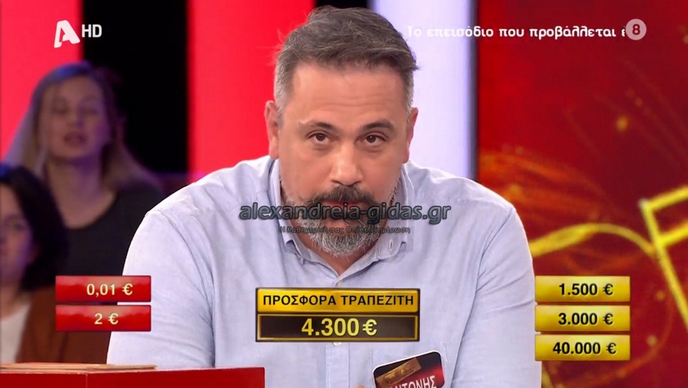Αν και οι 60.000 ευρώ βγήκαν νωρίς από το παιχνίδι, ο Αντώνης με υπομονή και τύχη έφτασε την προσφορά του τραπεζίτη στις 7.000 ευρώ και σταμάτησε το παιχνίδι.