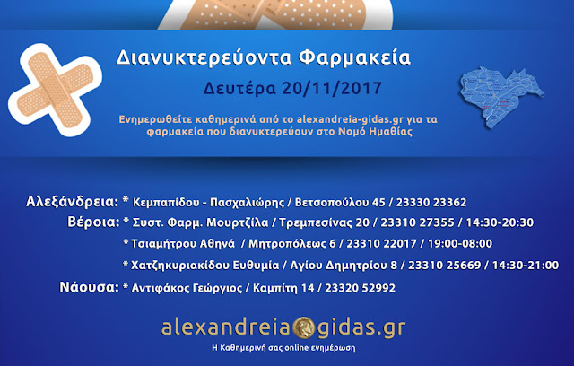 ΤΟΠΙΚΑ 20 Νοεμβρίου, 2017 posted by admin Share Εφημερεύοντα – διανυκτερεύοντα φαρμακεία Ημαθίας Δευτέρα 20 Νοεμβρίου Αλεξάνδρεια: Αφήστε μια απάντηση Ακύρωση απάντησηςΗ ηλ. διεύθυνση σας δεν δημοσιεύεται. Τα υποχρεωτικά πεδία σημειώνονται με *Σχόλιο * Όνομα Email Ιστότοπος Αποθήκευσε το όνομά μου, email, και τον ιστότοπο μου σε αυτόν τον πλοηγό για την επόμενη φορά που θα σχολιάσω.