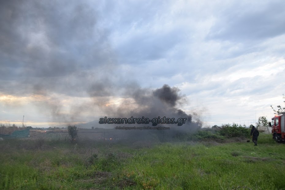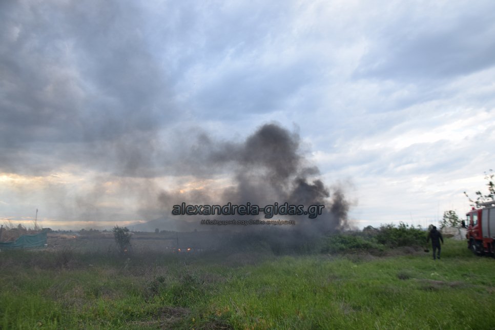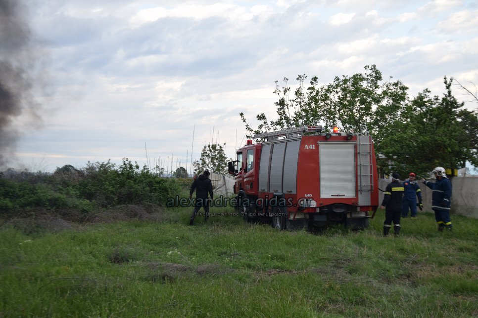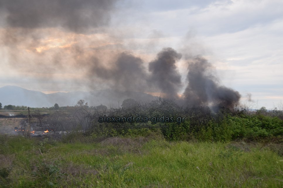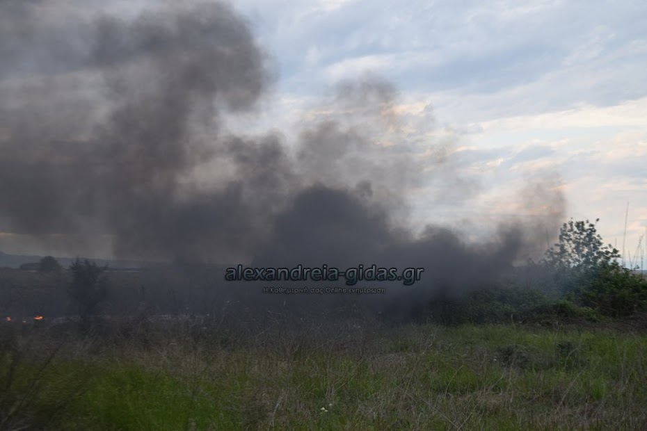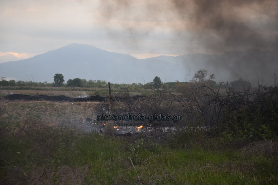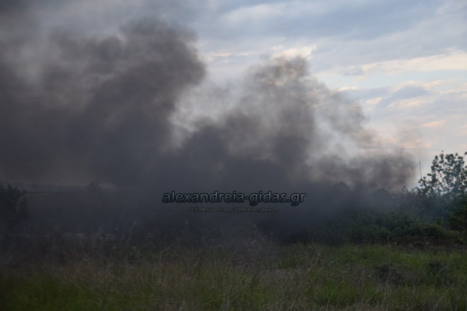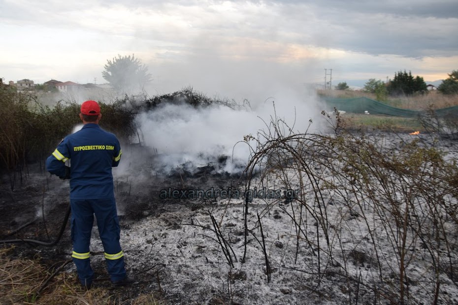 Η φωτιά ξέσπασε σε χόρτα σε αγροτική περιοχή ανάμεσα στην Αλεξάνδρεια και στον Σχοινά,  όπου υπήρχαν και λάστιχα τα οποία δημιούργησαν πυκνά σύννεφα μαύρου καπνού που ήταν ορατά από μακριά.