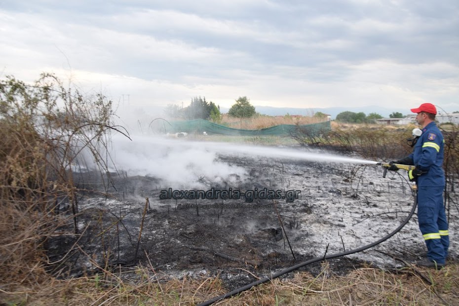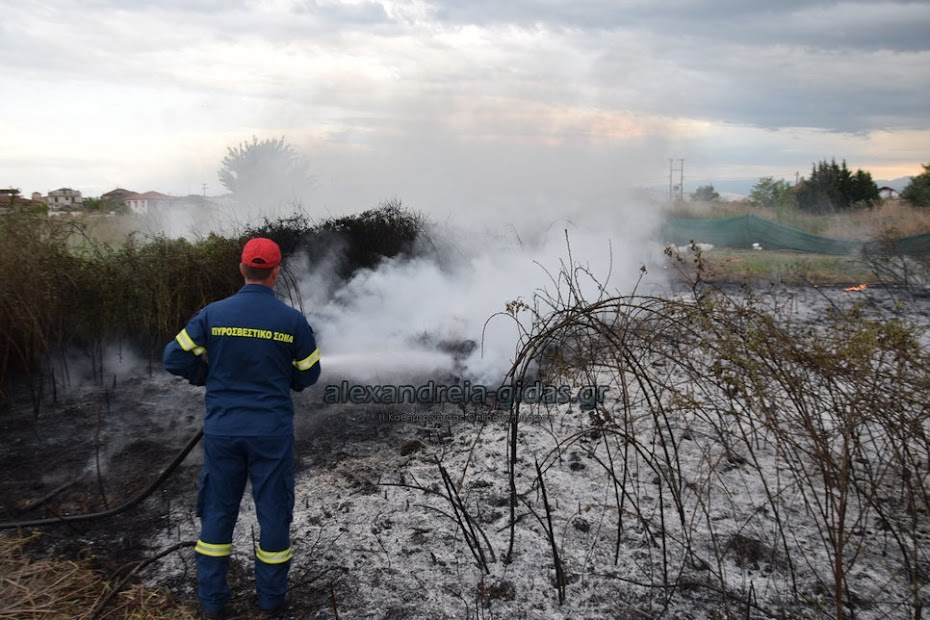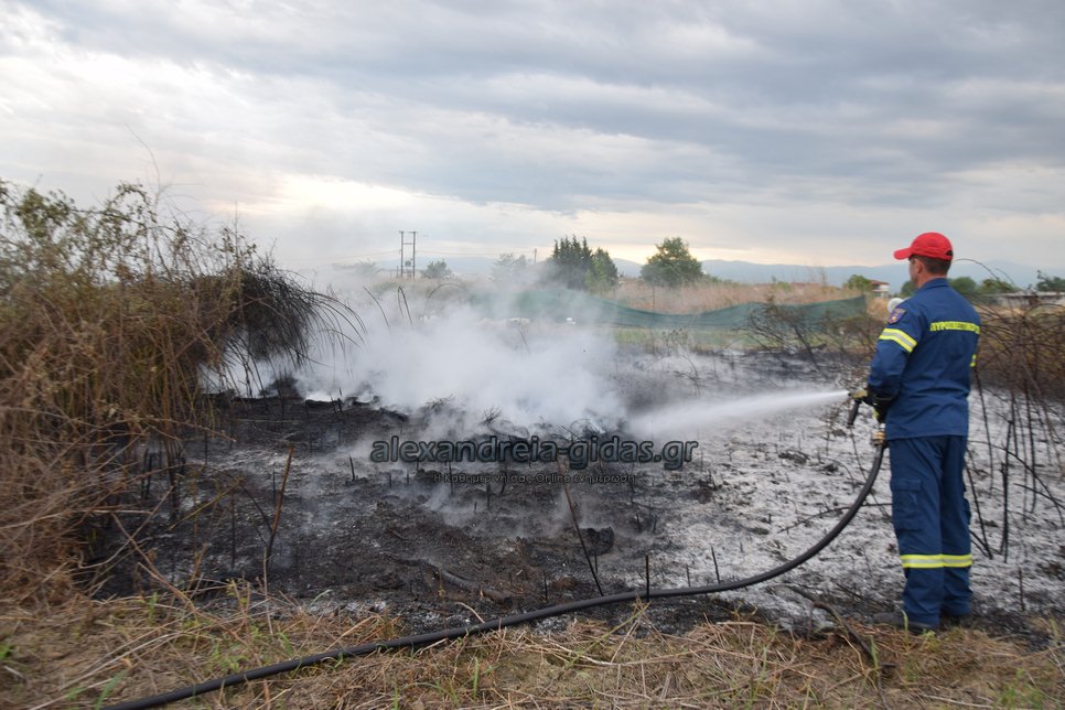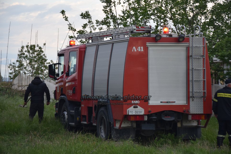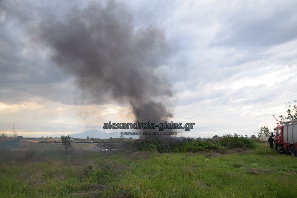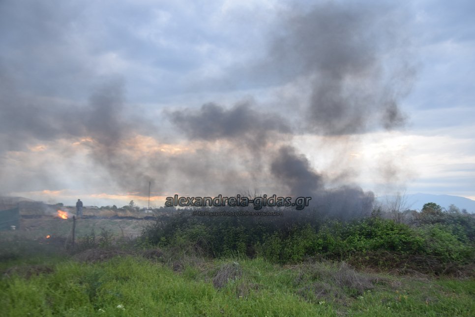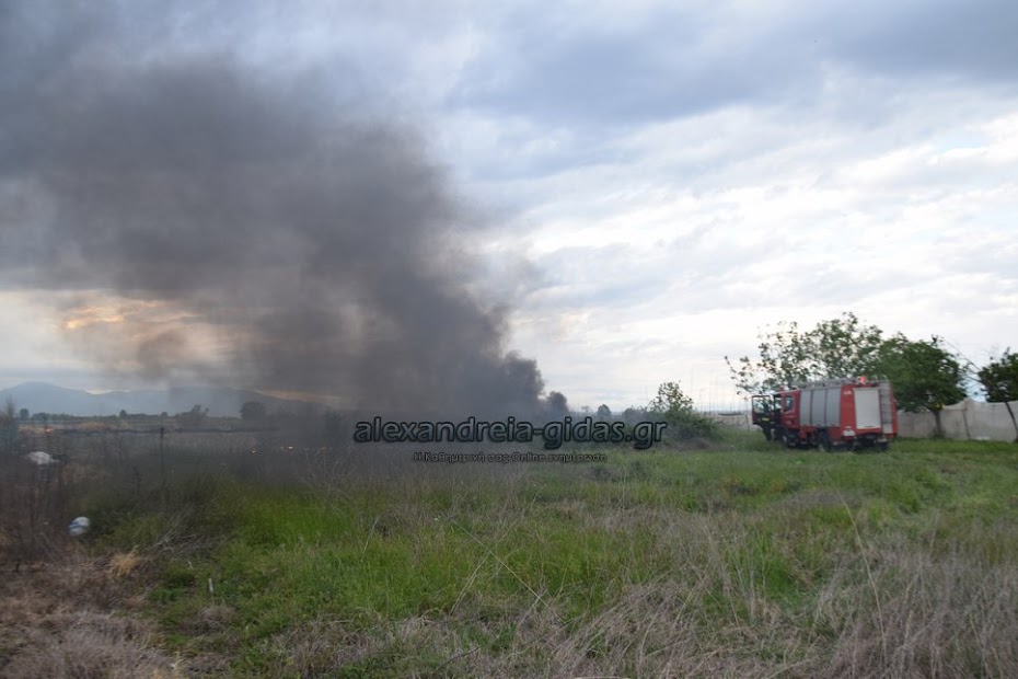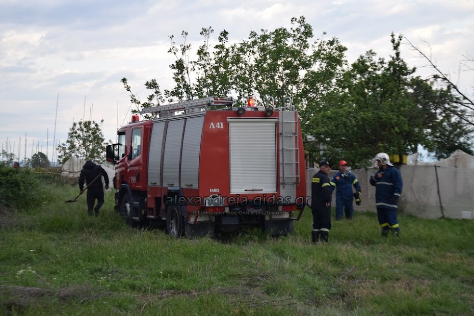 Η φωτιά ξέσπασε σε χόρτα σε αγροτική περιοχή ανάμεσα στην Αλεξάνδρεια και στον Σχοινά,  όπου υπήρχαν και λάστιχα τα οποία δημιούργησαν πυκνά σύννεφα μαύρου καπνού που ήταν ορατά από μακριά.