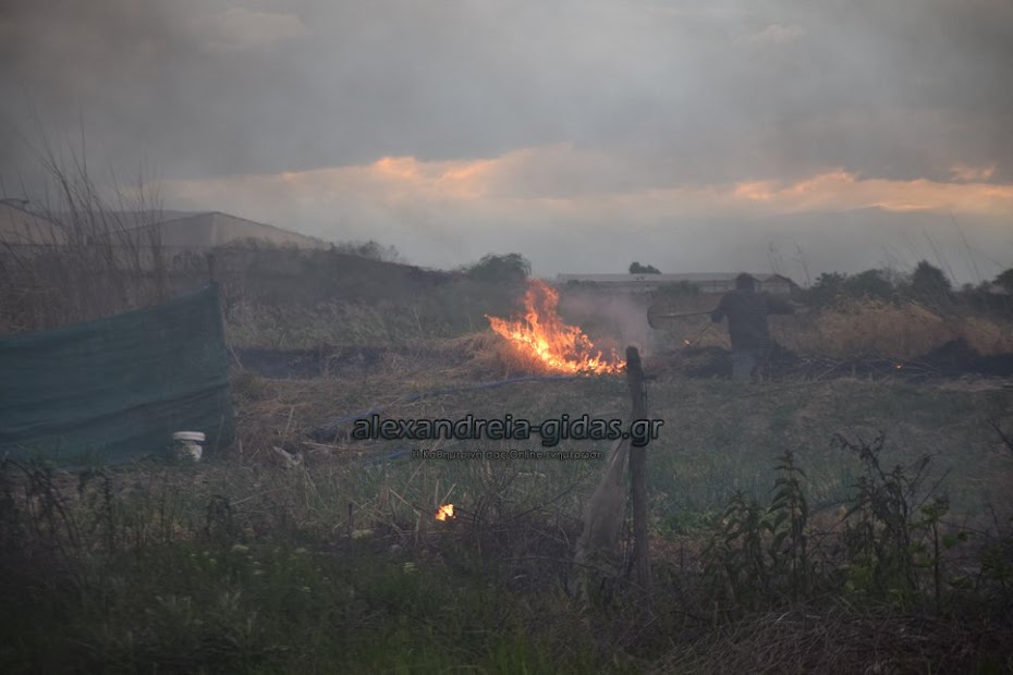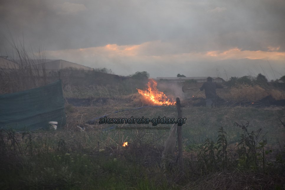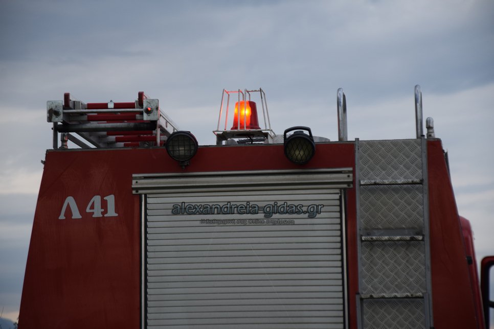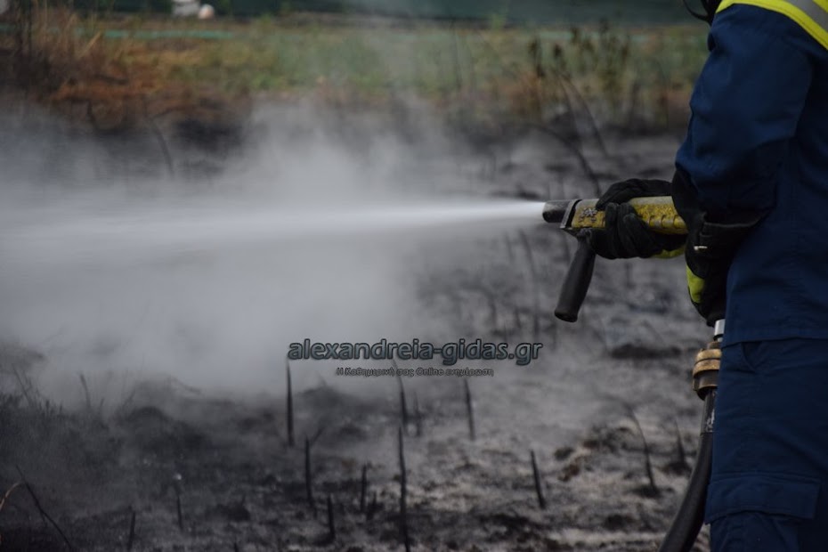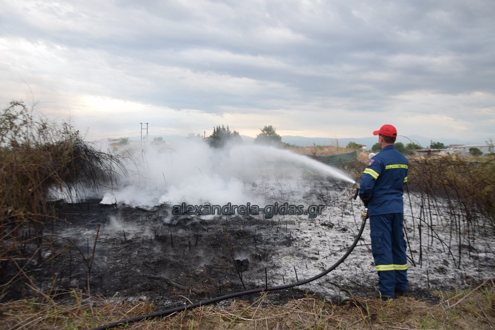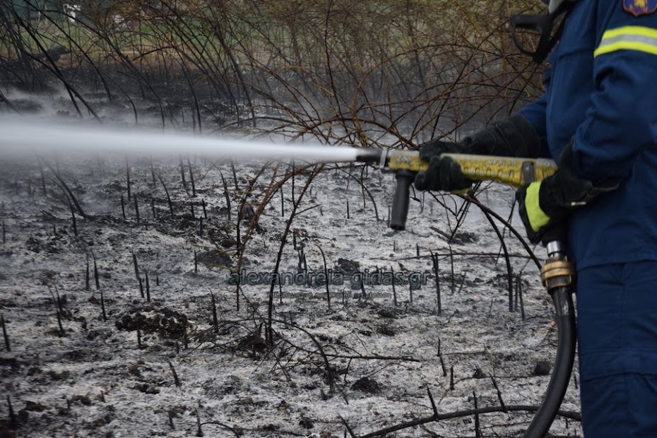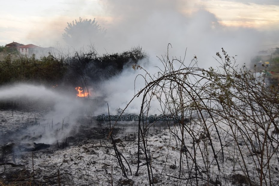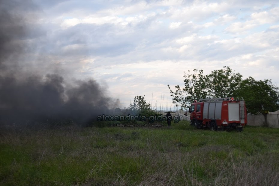 Η φωτιά ξέσπασε σε χόρτα σε αγροτική περιοχή ανάμεσα στην Αλεξάνδρεια και στον Σχοινά,  όπου υπήρχαν και λάστιχα τα οποία δημιούργησαν πυκνά σύννεφα μαύρου καπνού που ήταν ορατά από μακριά.