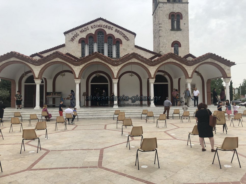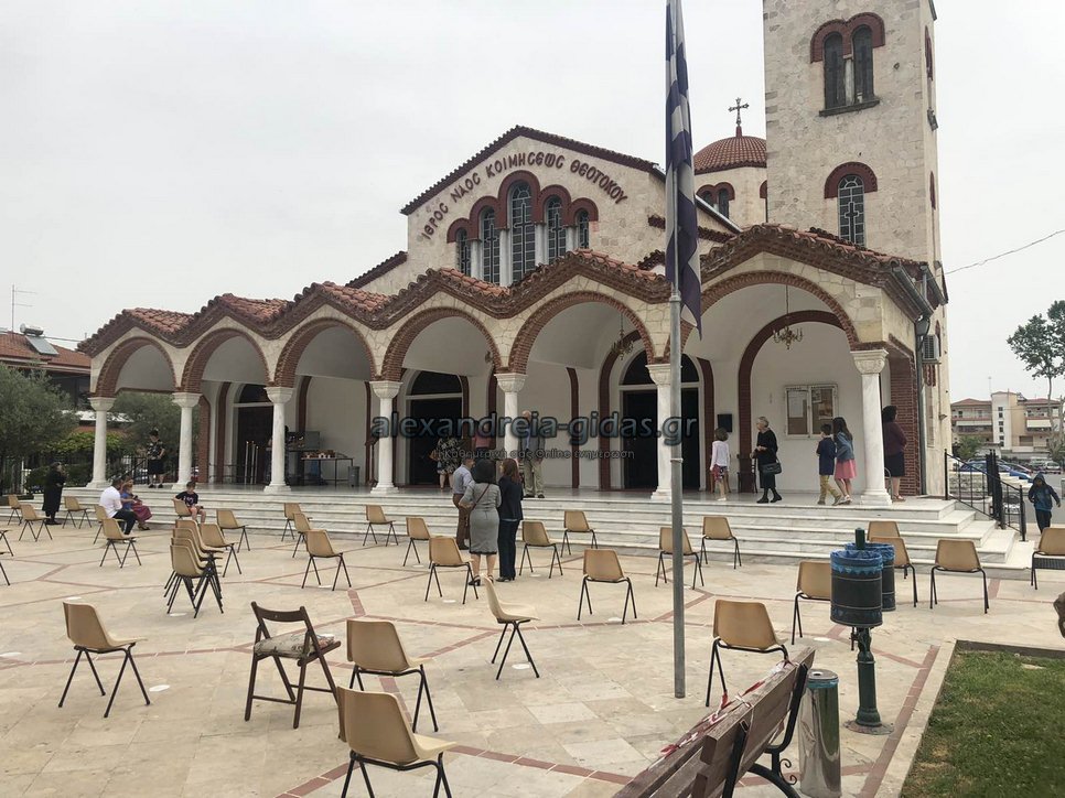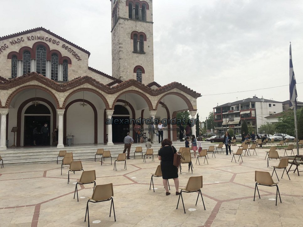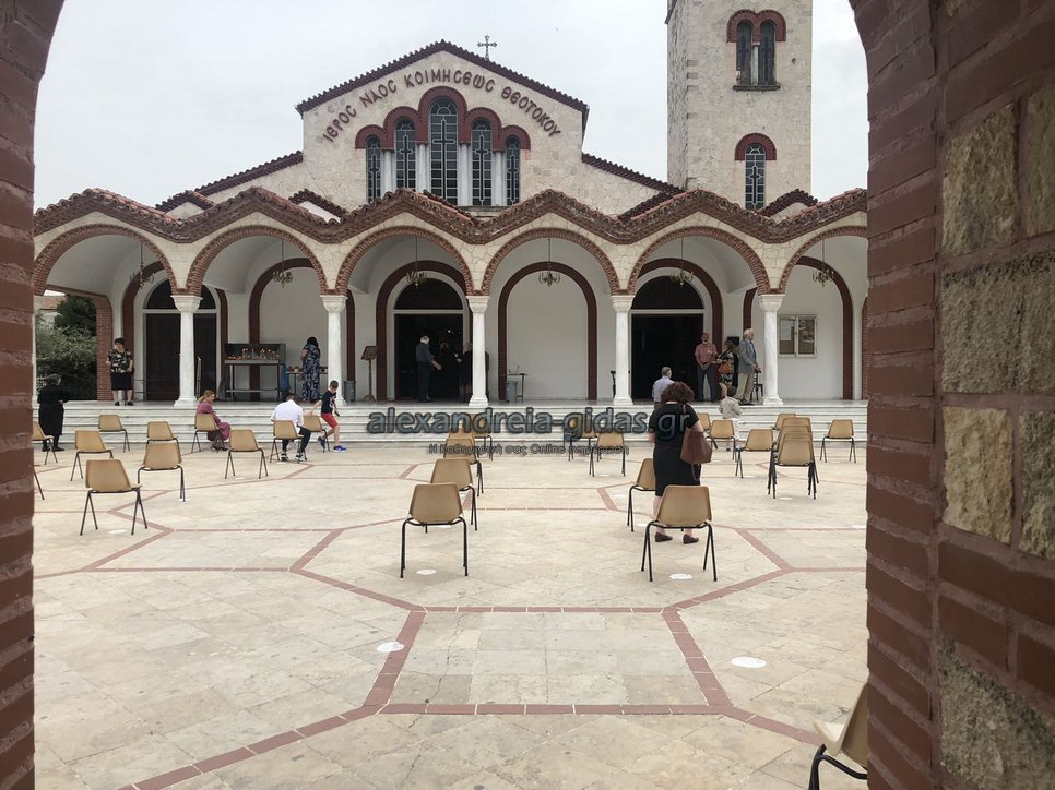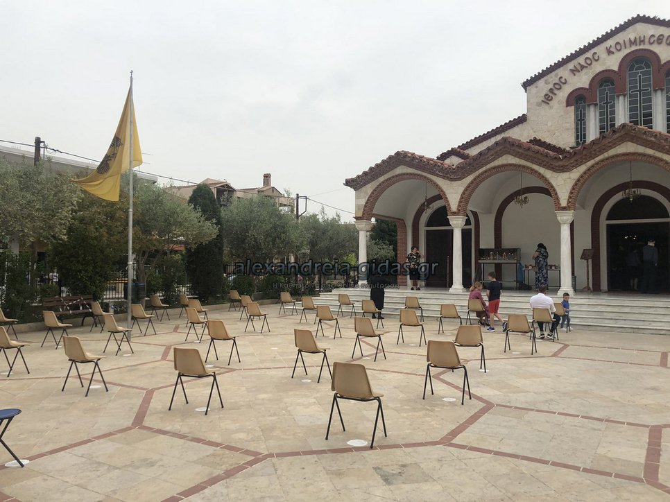 Στην Μητροπολιτικό Ιερό Ναό Κοιμήσεως της Θεοτόκου στην Αλεξάνδρεια, όπως θα δείτε και στις εικόνες παρακάτω, τοποθετήθηκαν καρέκλες και στον προαύλειο χώρο για να μπορέσουν περισσότεροι πιστοί να παρακολουθήσουν τη Θεία Λειτουργία.