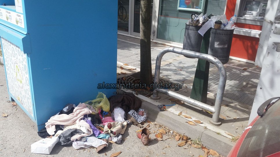 Σκουπίδια από τη μία και είτε παπούτσια και ρούχα βγαλμένα από τον ειδικό κάδο συγκέντρωσης είτε πεταμένα έξω από αυτόν.