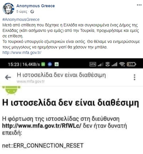 Με ανάρτησή τους που δημοσίευσαν στην σελίδα τους στο Facebook, οι Anonymous Greece ανέφεραν πως βρίσκονταν πίσω από την ψηφιακή «κατάρρευση» της επίσημης σελίδας του τουρκικού ΥΠΕΞ, που παρέμεινε ανενεργή για περίπου τρεις ώρες.