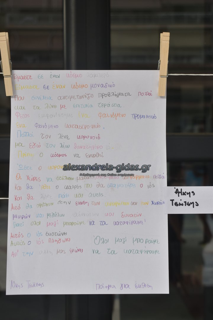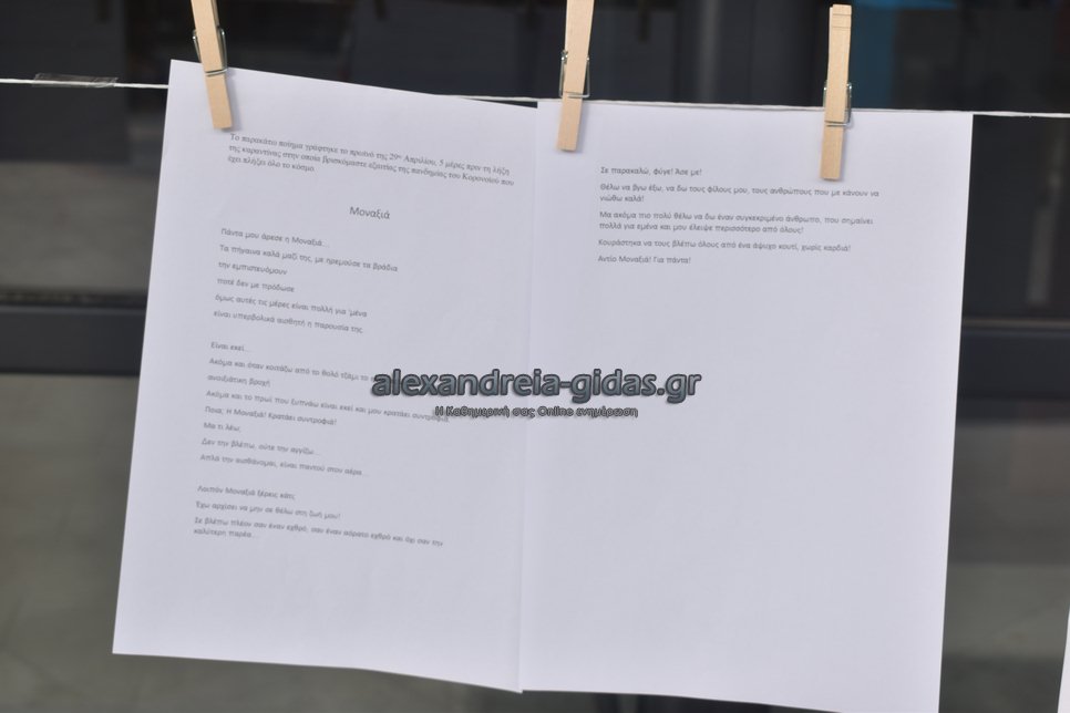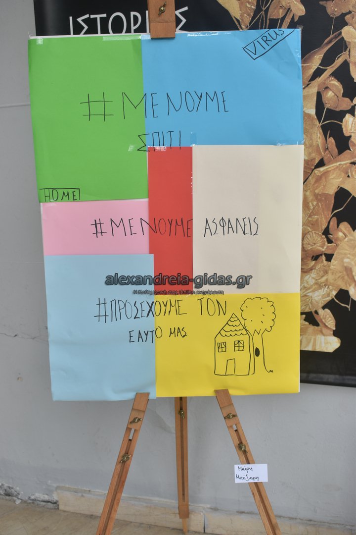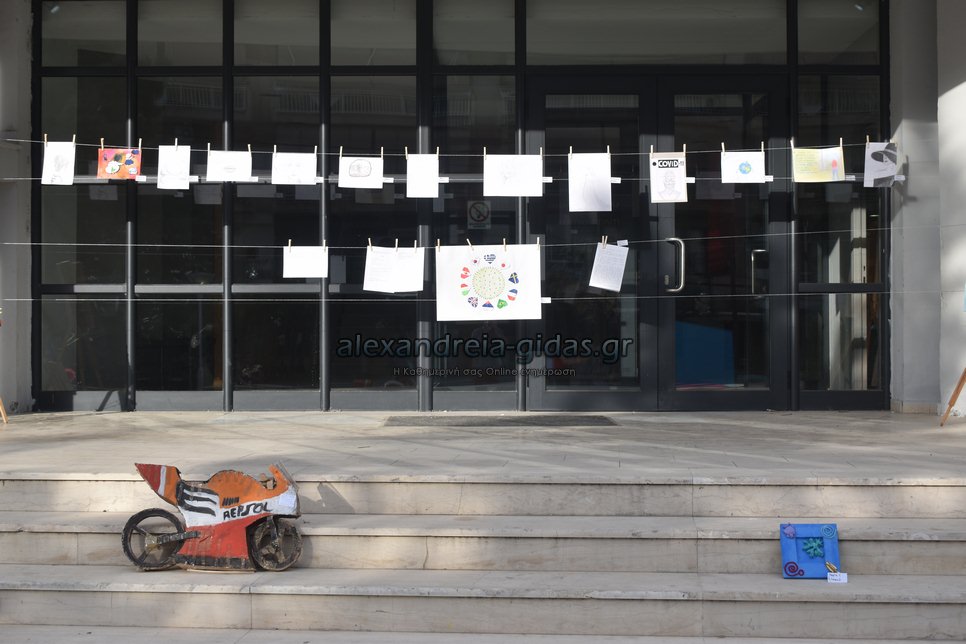Η έκθεση έγινε μπροστά στο Πνευματικό Κέντρο Αλεξάνδρειας και παρουσιάστηκαν δημιουργίες των μαθητών με θέμα τον κορονοϊό και τις ημέρες της καραντίνας.