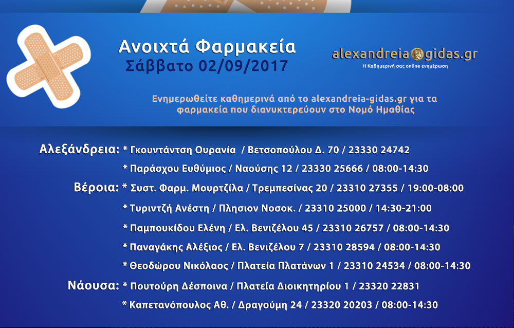 ΤΟΠΙΚΑ 2 Σεπτεμβρίου, 2017 posted by admin Share Ανοιχτά φαρμακεία Ημαθίας Σάββατο 2 Σεπτεμβρίου Αλεξάνδρεια: Αφήστε μια απάντηση Ακύρωση απάντησηςΗ ηλ. διεύθυνση σας δεν δημοσιεύεται. Τα υποχρεωτικά πεδία σημειώνονται με *Σχόλιο * Όνομα Email Ιστότοπος Αποθήκευσε το όνομά μου, email, και τον ιστότοπο μου σε αυτόν τον πλοηγό για την επόμενη φορά που θα σχολιάσω.