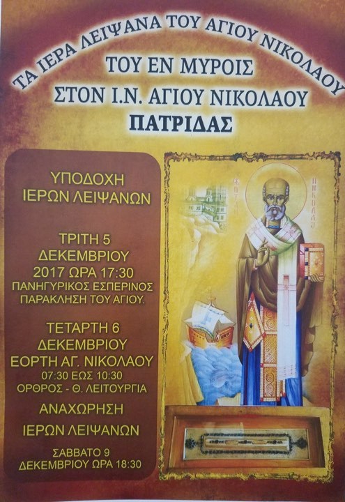 Επί τη Εορτή του Αγίου Νικολάου στον πανηγυριζοντα ομώνυμο ομώνυμο Ιερό Ναό στην Πατρίδα θα πραγματοποιηθεί η υποδοχή των Ιερών Λειψάνων του Αγίου Νικολάου του εν Μυροις προς αγιασμό των πιστών.