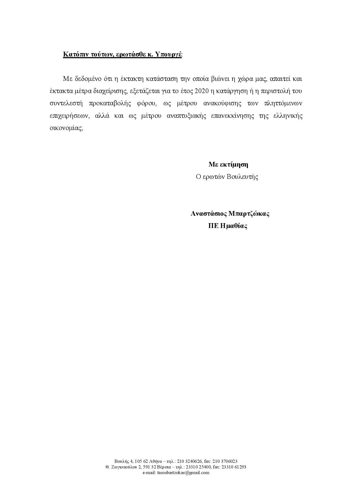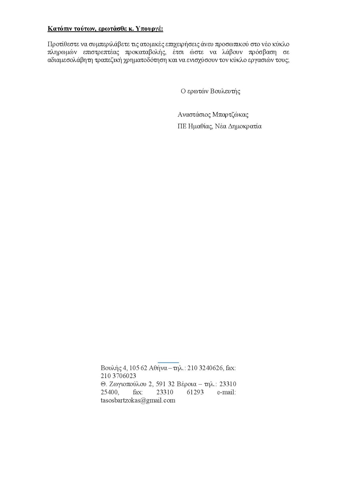 Ιδιαίτερη ικανοποίηση για τα μέτρα ανακούφισης της προκαταβολής φόρου και της υπαγωγής των ατομικών επιχειρήσεων, χωρίς προσωπικό, καθώς αποτελούσαν αντικείμενο κοινοβουλευτικής μου παρέμβασης.