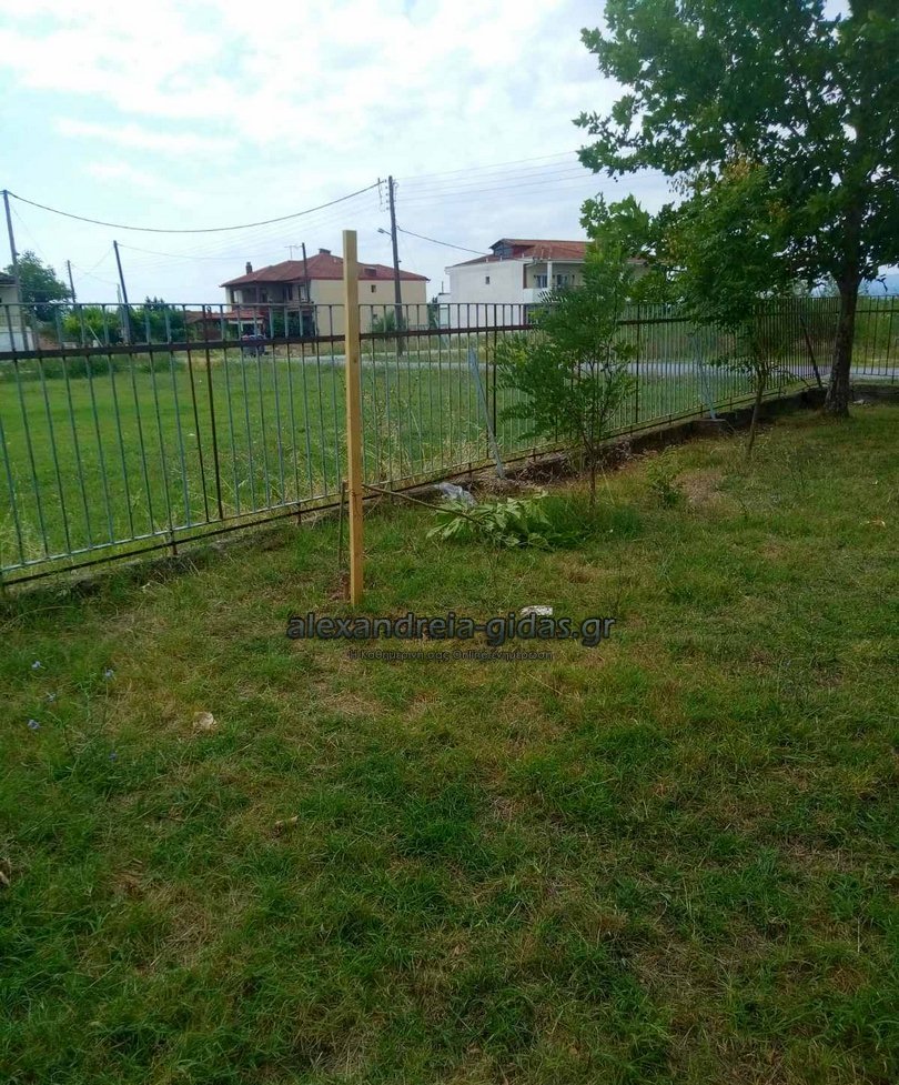 Σπασμένα τα δέντρα που φύτευσαν πριν από λίγες ημέρες στην γιορτή αποφοίτησης και αυλή γεμάτη σκουπίδια αντίκρισαν η καθαρίστρια και ο σχολικός φύλακας του 7ου Δημοτικού Σχολείου Αλεξάνδρειας το πρωί της Δευτέρας 6 Ιουλίου 2020.