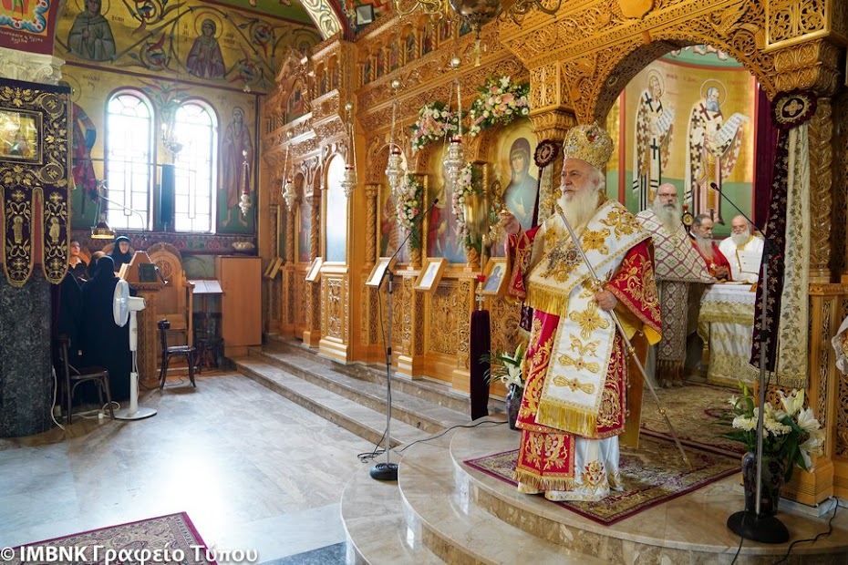 «Οἱ τῷ αἵματι Χριστοῦ τάς ψυχάς σφραγισθέντες…αἷμα ἅγιον ἐκ μαρτυρικῆς πηγῆς ἀναβλύζον ἡμῖν…μετ᾽ εὐφροσύνης πνευματικῆς ἀντλήσωμεν» (ιδιόμελον Λιτής), ακούσαμε τον ιερό υμνογράφο να θεολογεί ψάλλοντας επί τη ιερά μνήμη της Αγίας Παρθενομάρτυρος του Χριστού Κυριακής. Μία πηγή πλουσιόδωρη, μία «βρύσις πολύκρουνος» η ιερή μορφή της Αγίας Μεγαλομάρτυρος Κυριακής που ιδιαίτερα τιμά η Ιερά μας Μητρόπολη στην Ιερά αυτή Μονή. Μία πηγή στην οποία μας καλεί η εκκλησία να προσέλθουμε, όχι για να λάβουμε μόνο ιάματα και θεραπείες, αλλά κυρίως για να διδαχθούμε όλοι εμείς οι χριστιανοί, οι σφραγισμένοι με το αίμα του Σωτήρος Χριστού, το ένθεο παράδειγμα της τέλειας αφιέρωσης της στον δημιουργό Θεό. Άλλωστε αυτό υποδηλώνει και το όνομα της, Κυριακή. Αυτή που ανήκει αποκλειστικά στον Κύριο. Αυτή που αφιέρωσε την ψυχή και το σώμα της στον Νυμφίο Χριστό. Αυτή που ανατέθηκε εκ κοιλίας μητρός στον Δημιουργό της. Αυτή που με τον μαρτυρικό θάνατο της προσέφερε την ζωή της στον Κύριο.