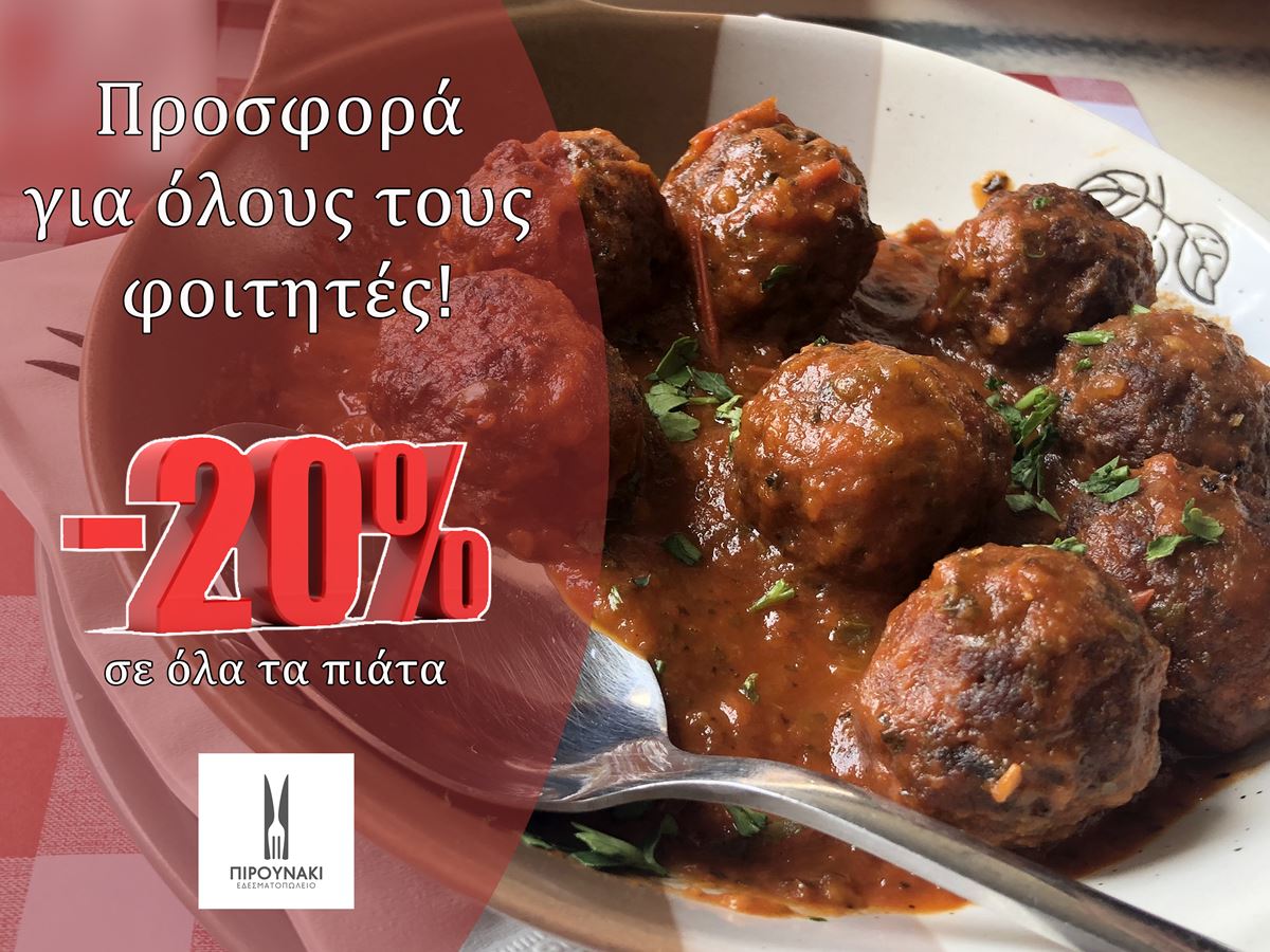 Μη ξεχνάτε επίσης τη μοναδική προσφορά που έχει ετοιμάσει η επιχείρηση για όλους τους φοιτητές. Αν είσαι φοιτητής μέχρι το τέλος Σεπτεμβρίου στο Μεζεδοπωλείο Πιρουνάκι έχεις έκπτωση 20% σε ΟΛΑ τα πιάτα για να απολαύσεις με άνεση ότι τραβάει η ψυχή σου απλά με την επίδειξη της φοιτητικής σου ταυτότητας!