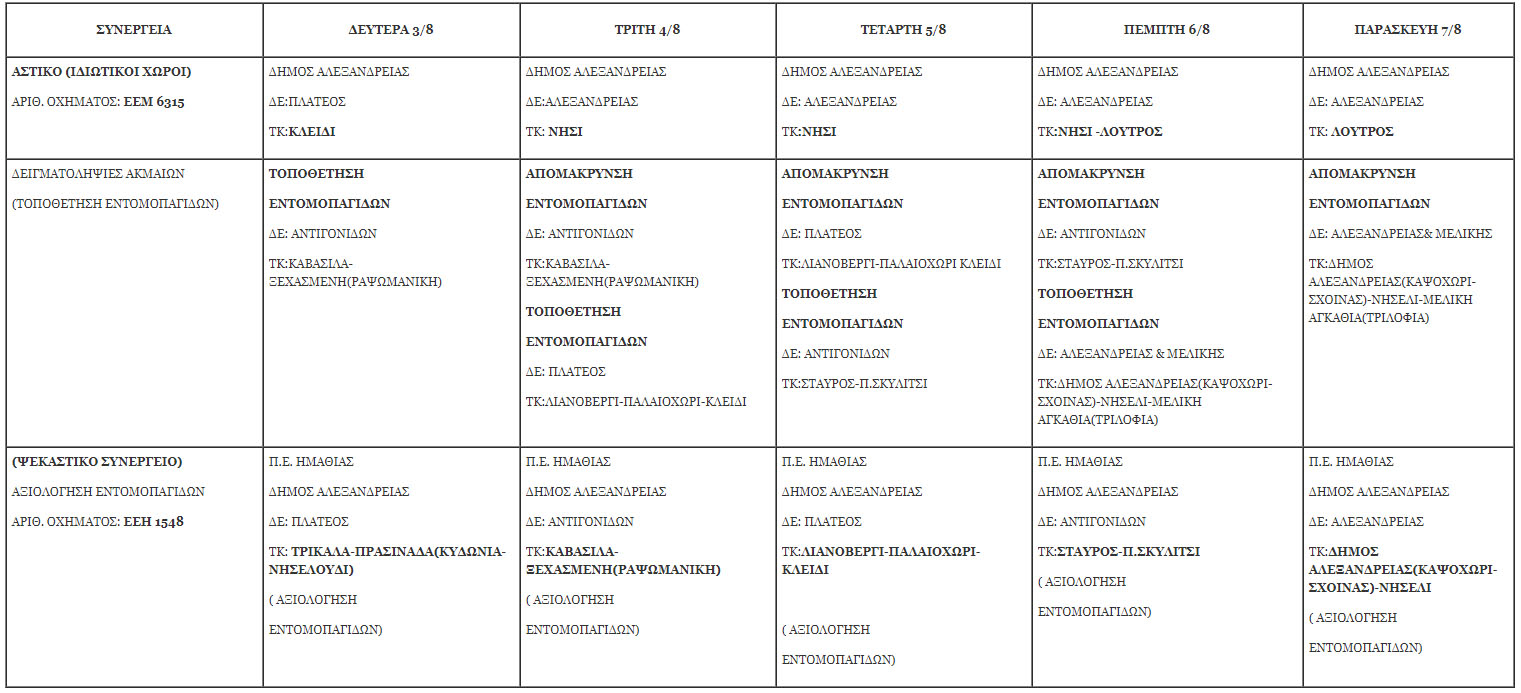 Ο Δήμος Αλεξάνδρειας ανακοινώνει το πρόγραμμα Αστικής Επίγειας Καταπολέμησης Κουνουπιών για την εβδομάδα από Δευτέρα 3, έως και Παρασκευή 7 Αυγούστου 2020.