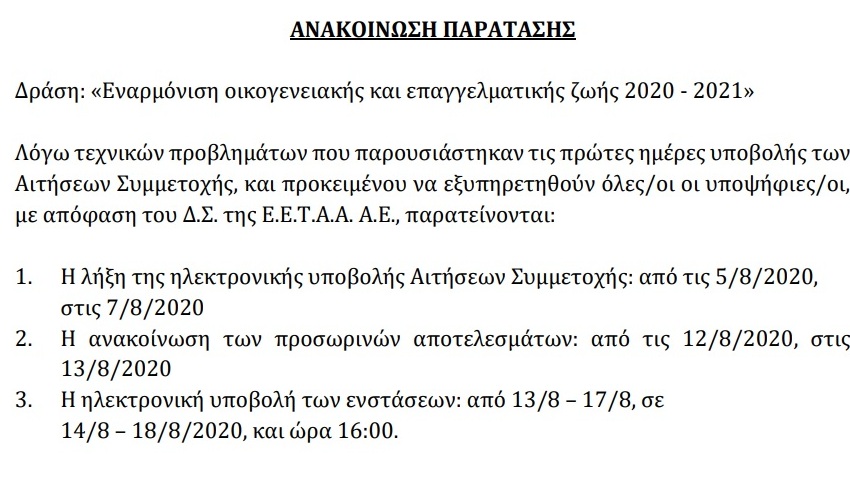 Το EUROPEDIA ΚΔΑΠ ΑΛΕΞΑΝΔΡΕΙΑΣ ενημερώνει πως δόθηκε παράταση στην ηλεκτρονική υποβολή αιτήσεων στο πρόγραμμα “Εναρμόνιση οικογενειακής και επαγγελματικής ζωής 2020-2021”.