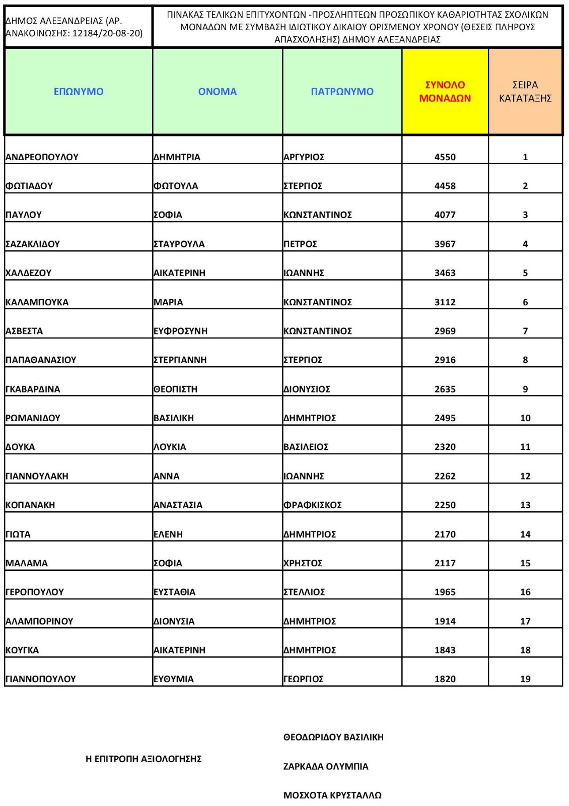 Ο Δήμος Αλεξάνδρειας ανακοινώνει τους Πίνακες με τα τελικά αποτελέσματα της Προκήρυξης για την πρόσληψη, με σύμβαση εργασίας ιδιωτικού δικαίου ορισμένου χρόνου, συνολικά πενήντα εννέα (59) ατόμων για την καθαριότητα των Σχολικών Μονάδων στο Δήμο Αλεξάνδρειας.
