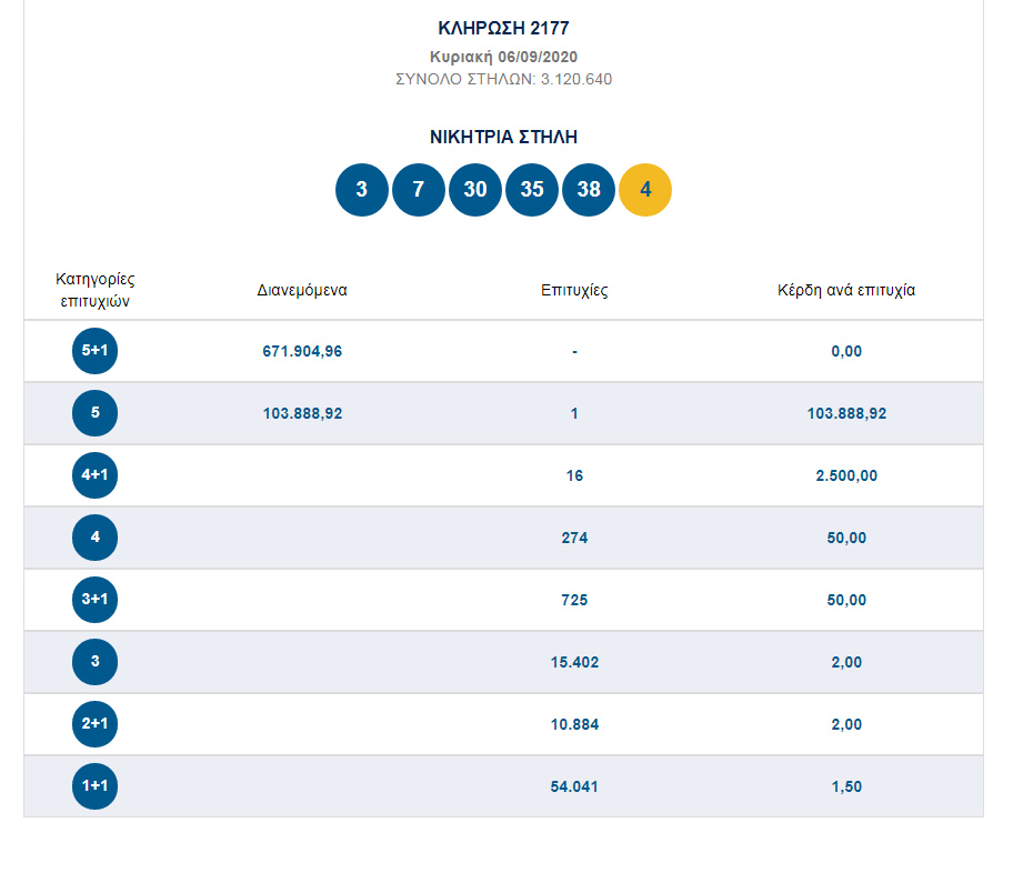Ένας ο νικητής στην κατηγορία των 5 αριθμών που κερδίζει πάνω από 100.000 ευρώ.