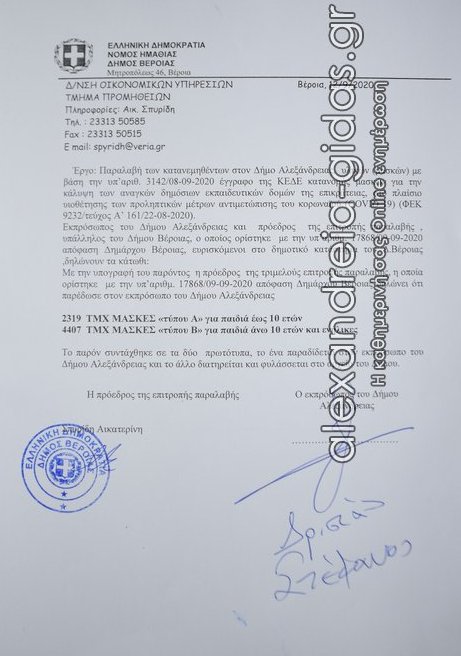 Τις μάσκες που θα μοιραστούν στα σχολεία του δήμου μας παρέλαβε σήμερα Σάββατο 12 Σεπτεμβρίου 2020 ο δήμος Αλεξάνδρειας.