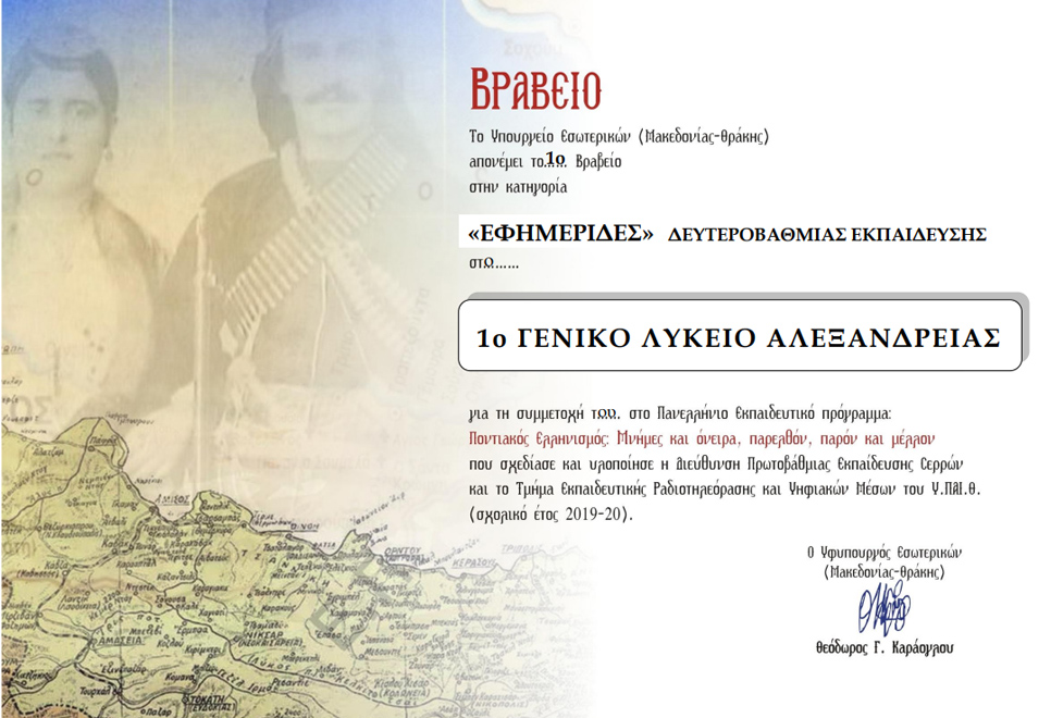 Ο Σύλλογος Διδασκόντων και ο Διευθυντής του 1ου Γενικού Λυκείου Αλεξάνδρειας εκφράζουμε τα συγχαρητήρια για το πρώτο (1ο) βραβείο που απέσπασε η εφημερίδα του σχολείου μας, «VIS VERBIS», στον Πανελλήνιο διαγωνισμό «ΠΟΝΤΙΑΚΟΣ ΕΛΛΗΝΙΣΜΟΣ – ΜΝΗΜΕΣ & ΟΝΕΙΡΑ» που διοργανώνεται από τη Διεύθυνση Πρωτοβάθμιας Εκπαίδευσης Σερρών σε συνεργασία με το Υπουργείο Εσωτερικών (Μακεδονίας – Θράκης):
