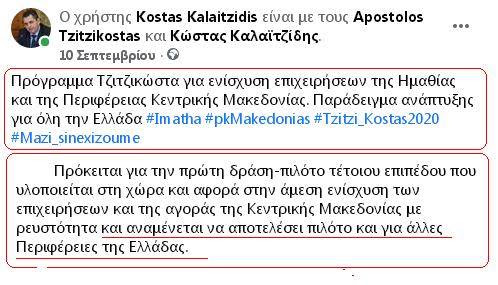 Να τι έγραψε ο Κώστας Καλαϊτζίδης στην ανάρτηση που έκανε στο facebook: «Είχα την τιμή να είμαι από του πρώτους που, πριν από ένα μήνα, ανακοινώσαμε δημόσια την πολύ σημαντική πρωτοβουλία του Απόστολου Τζιτζικώστα, να βρει τρόπο μέσω ευρωπαϊκών κονδυλίων και να εξασφαλίσει ποσό 150 εκατ. ευρώ για την οικονομική ενίσχυση επιχειρήσεων της Κεντρικής Μακεδονίας που επλήγησαν από την πανδημία του κορονοϊού.